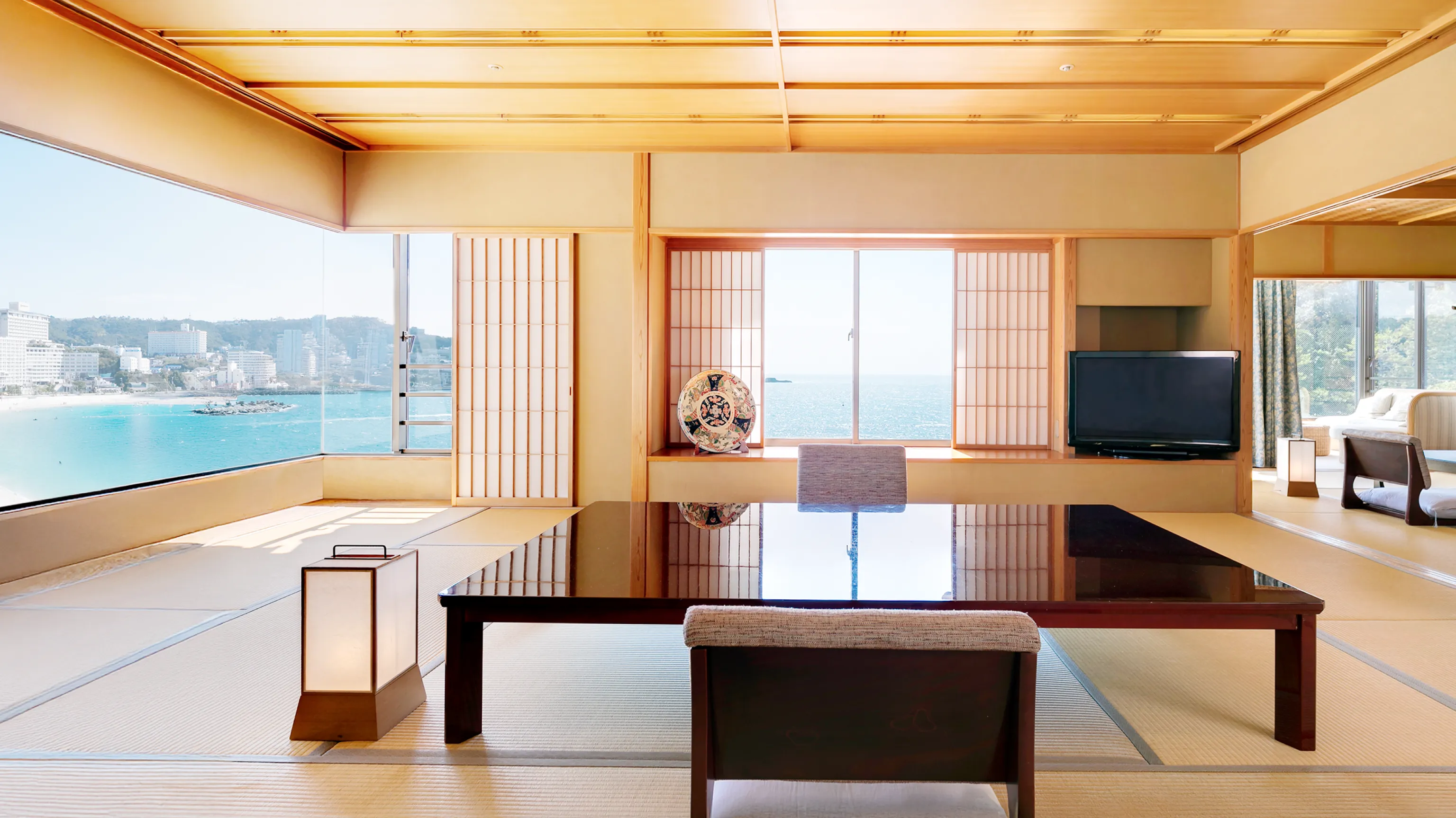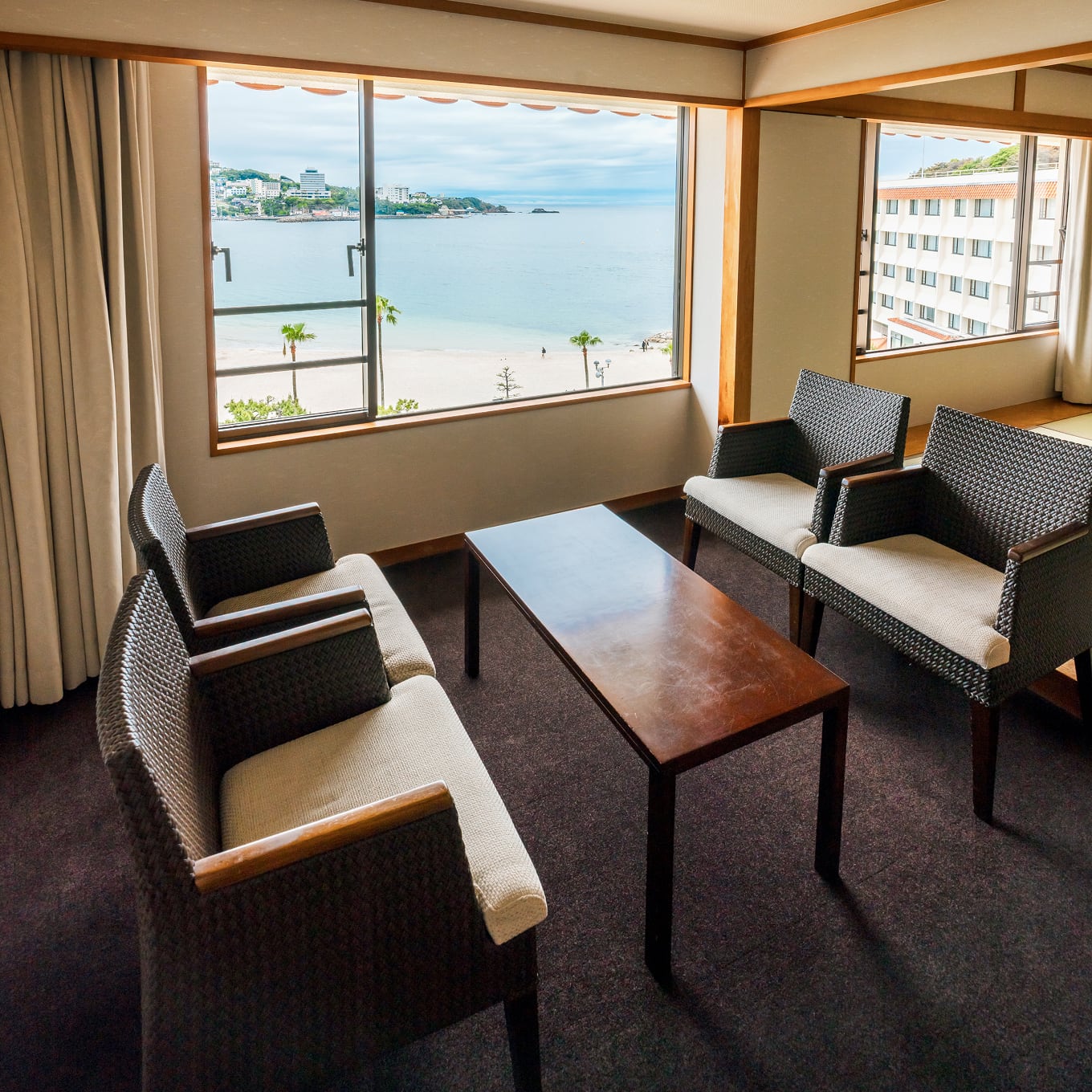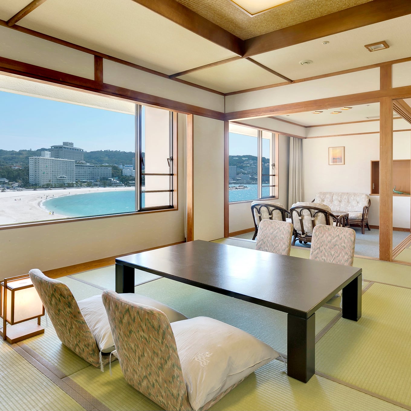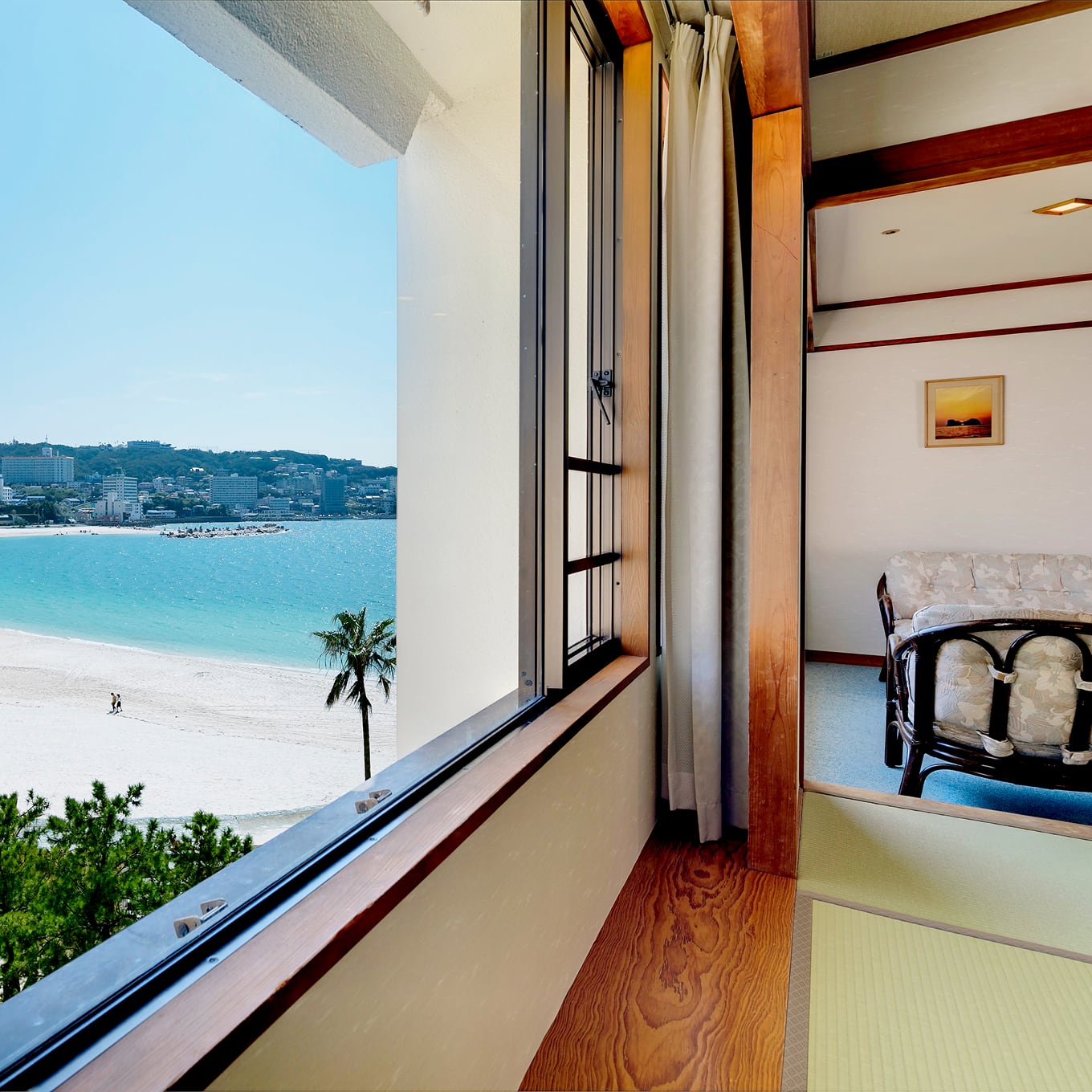 ゆとりのある空間にリビング・6畳スペース・ベッドルームを備え、白良浜と海の景色を一望できるお部屋です。