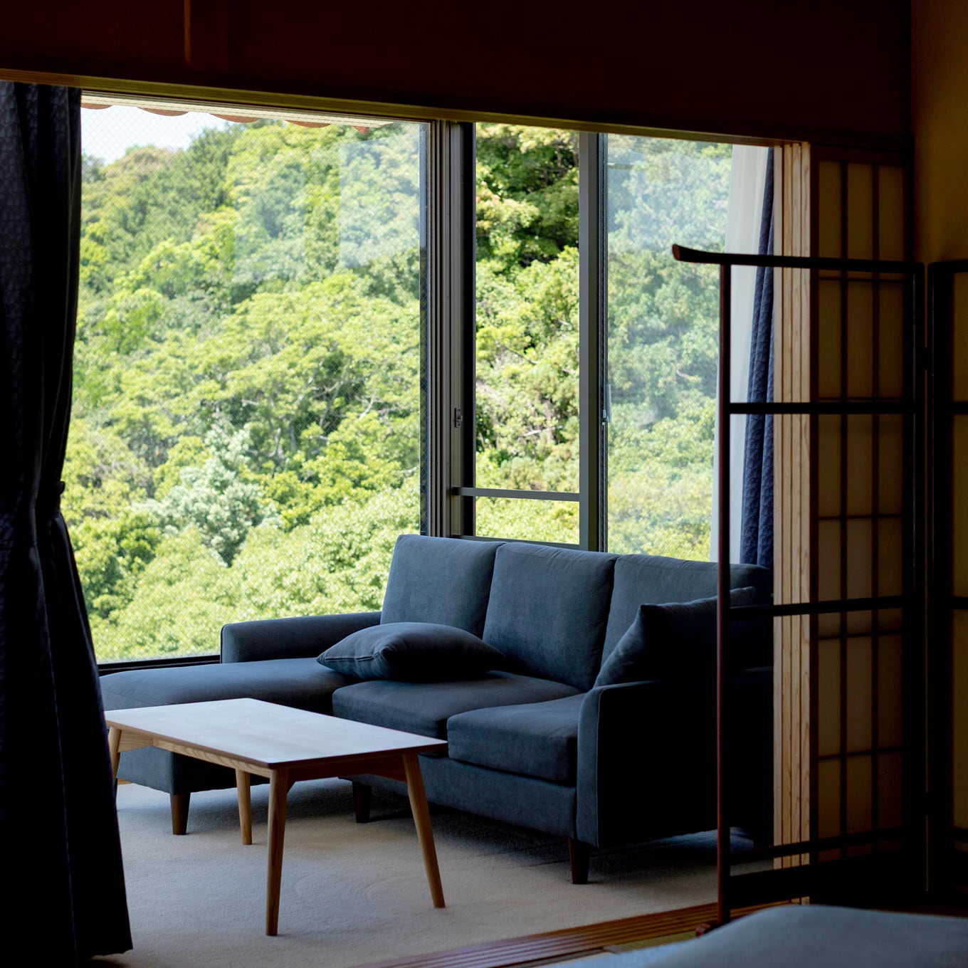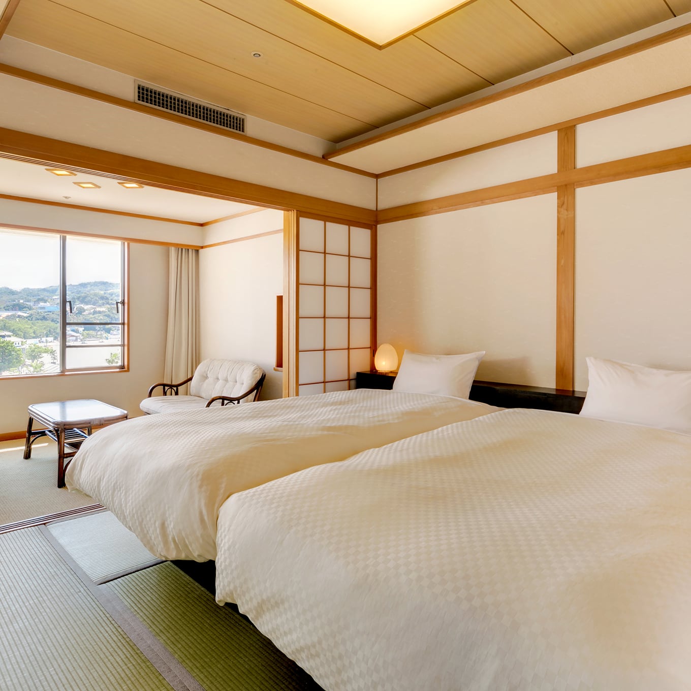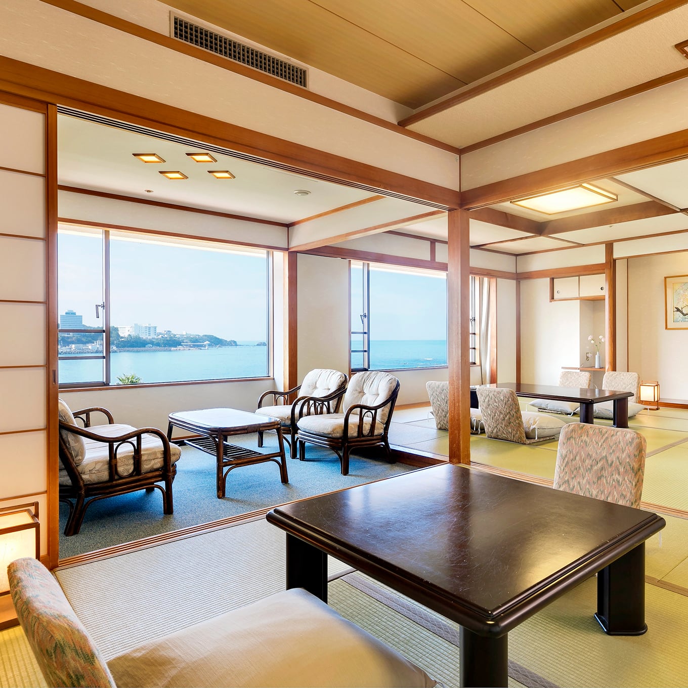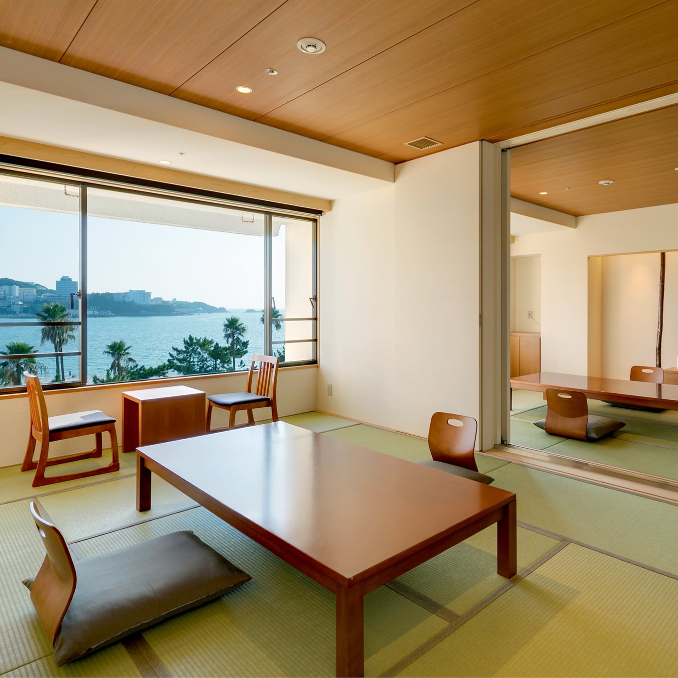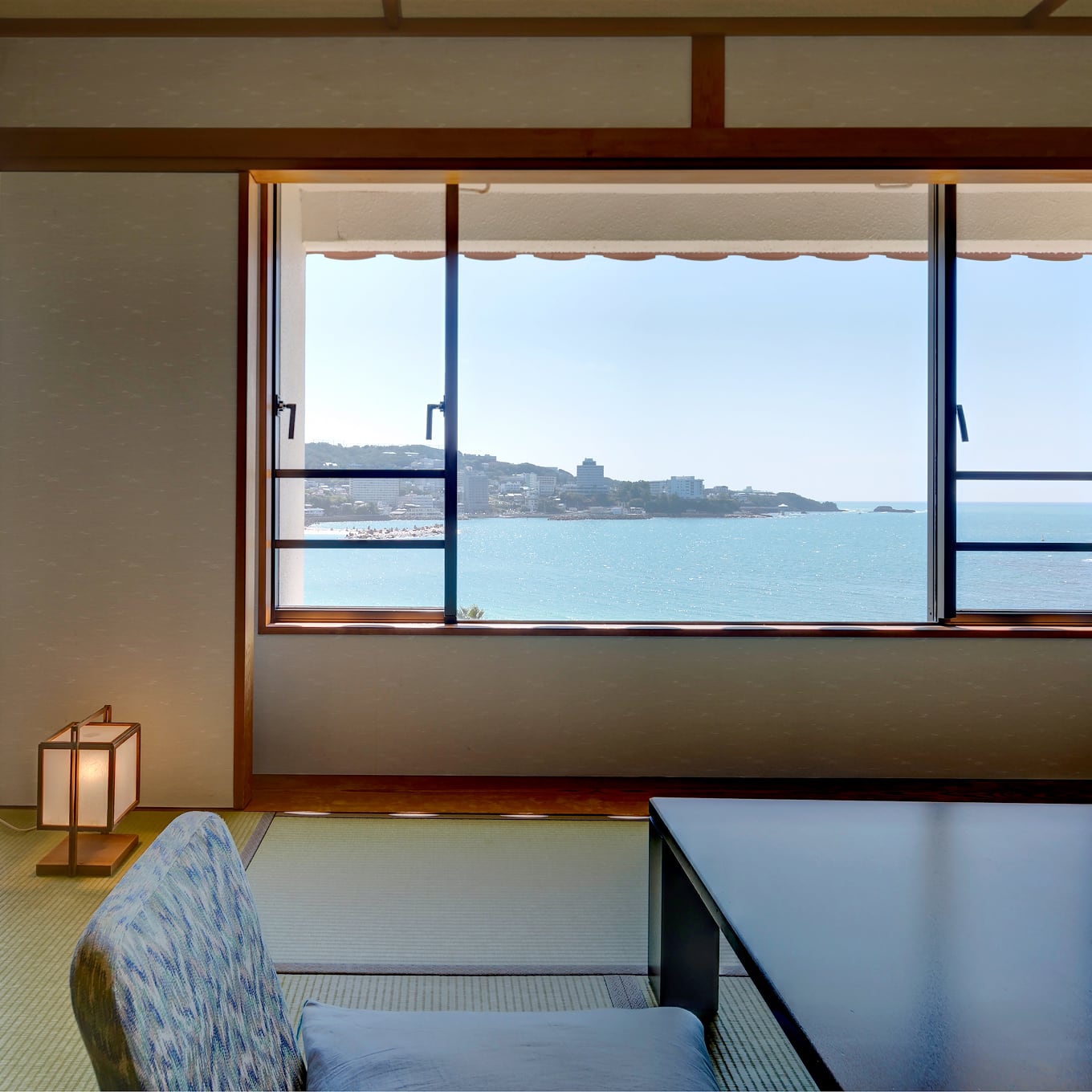 窓の面積を大きくとった二間続きの和室で、水平線まで海の景色を愉しめるお部屋です。