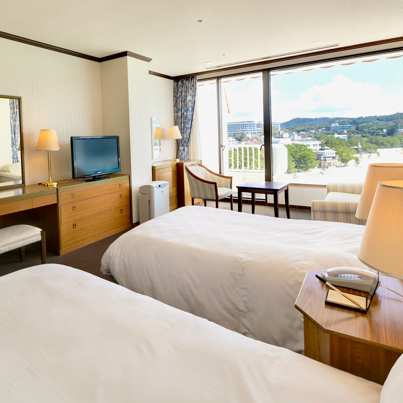 大きな窓ガラスから海の景色を愉しめる、建物の角にある1室のみのツインルームです。