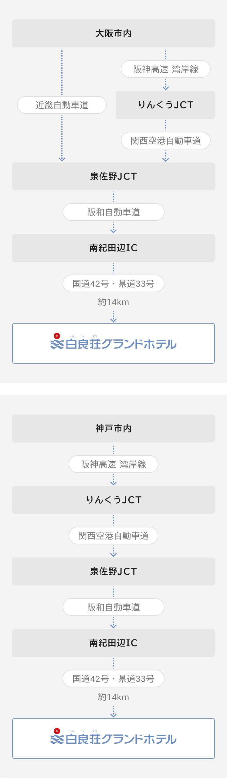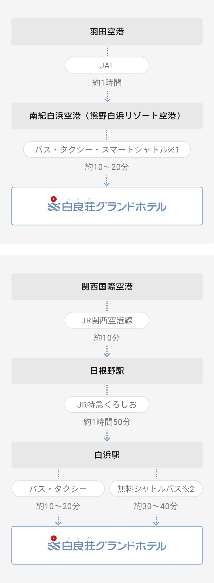 JR白浜駅から当ホテルへは、路線バスまたは南紀白浜温泉シャトルバスをご利用いただけます。