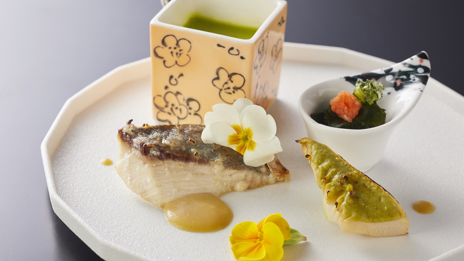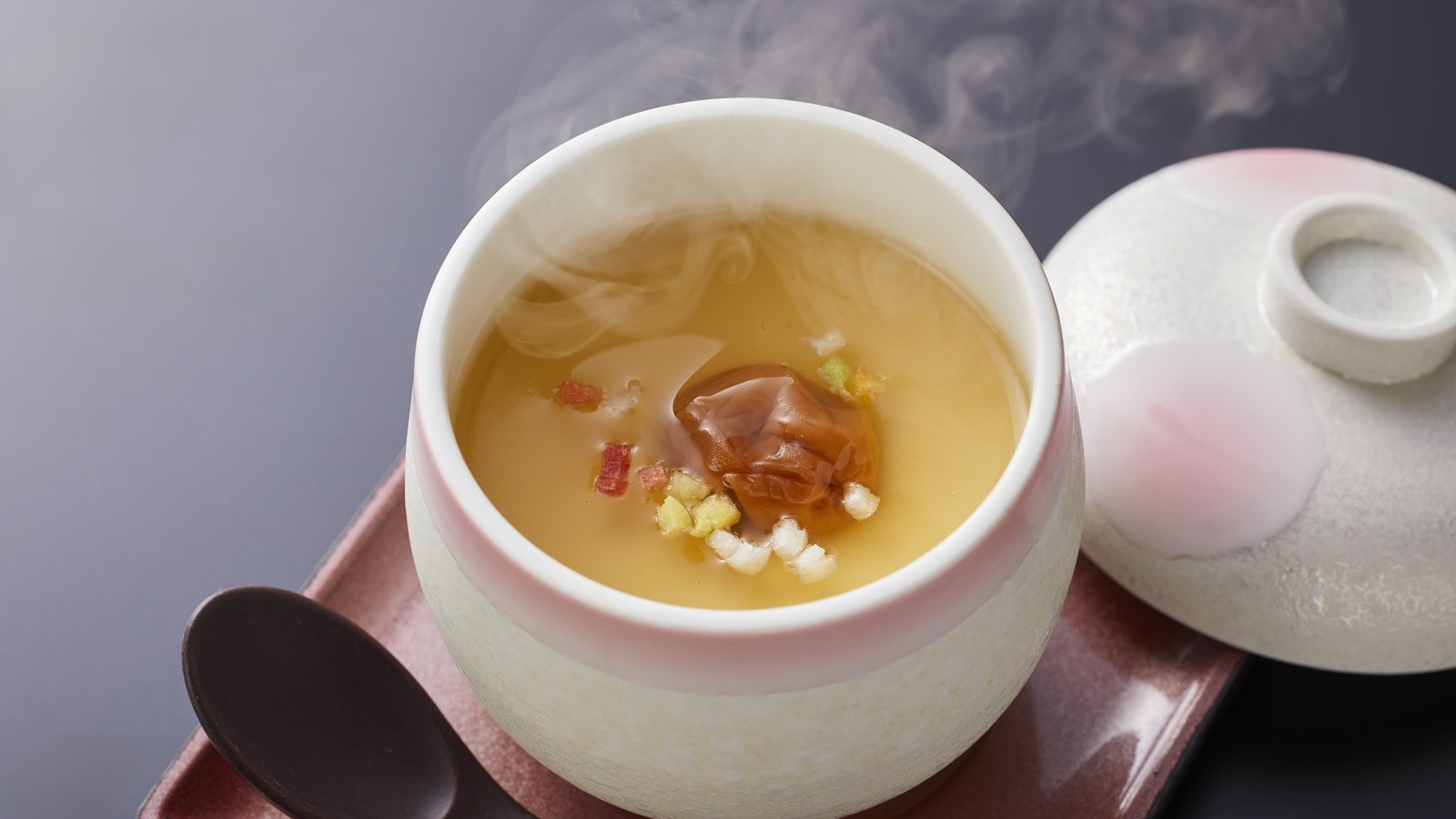 なめらかに仕立てた茶碗蒸しに、春の訪れを告げる梅の風味を添えました。厳選した卵と丁寧にとった出汁の旨味を、梅の酸味がきりりと引き締め、後味を爽やかに演出します。ほのかな梅の香りと共に、滋味深い味わいをお楽しみください。