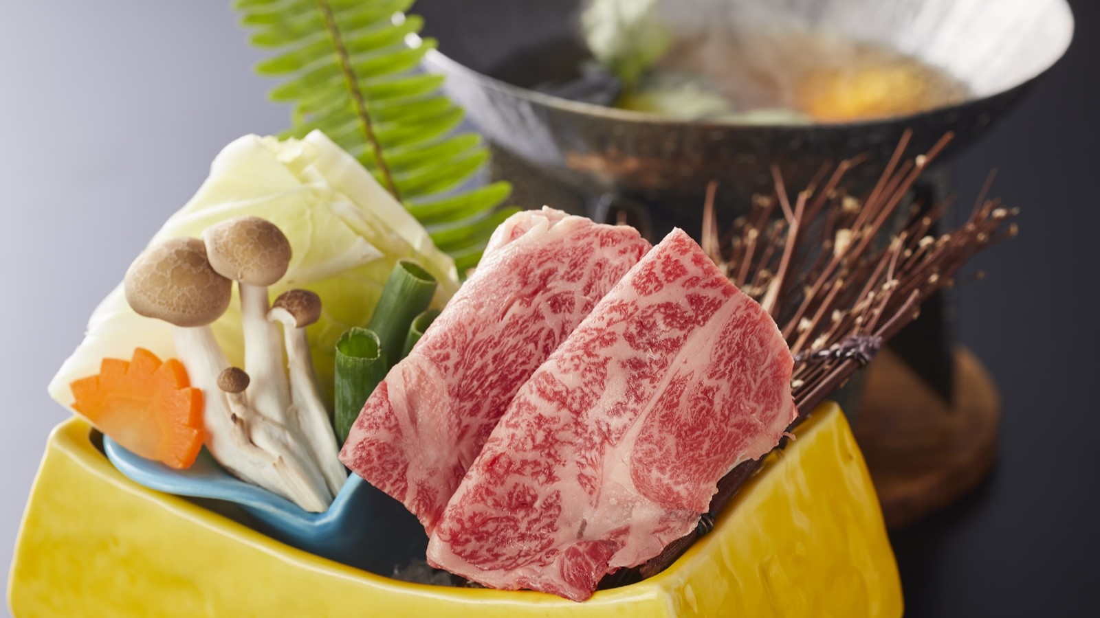 熊野牛のきめ細やかで柔らかな肉質と、口の中でふわっと広がる芳醇な脂の甘みをご堪能ください。昆布と鰹から丁寧に引いた出汁にさっと肉をくぐらせ、出汁の香りと肉本来の力強い味わいをお楽しみください。