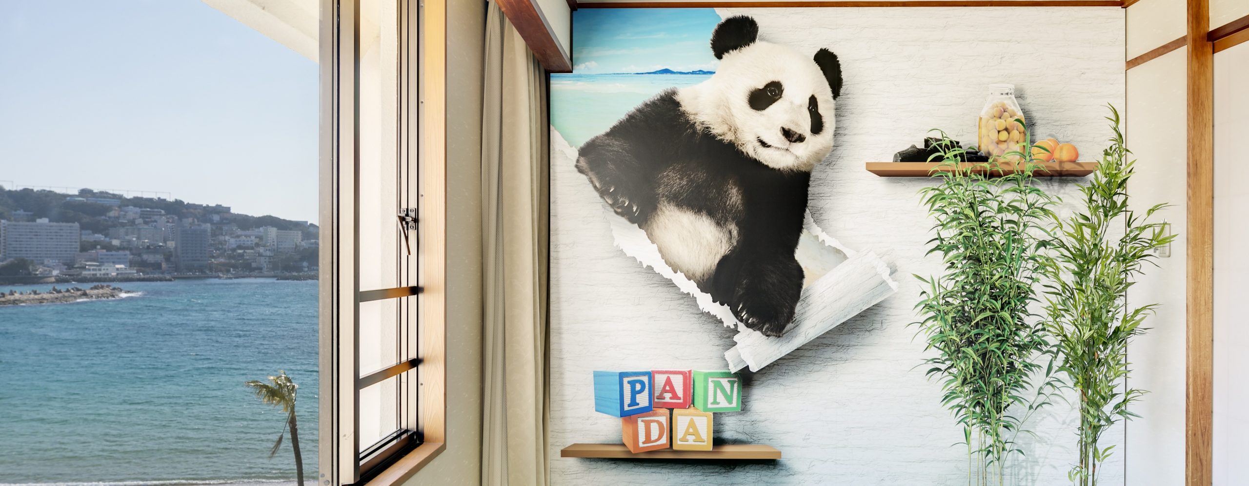 白良荘グランドホテルの「海が見えるパンダの部屋」は海の眺望を楽しみ、パンダに囲まれて過ごせる、ここだけのひとときを楽しめるお部屋です。