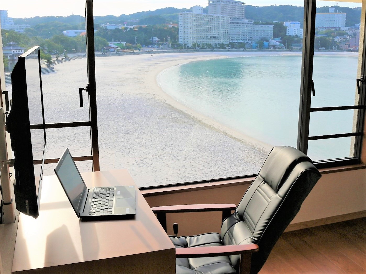 海を望む客室にデスク、椅子、オンラインミーティング用のモニターなどビジネス用備品をご用意いたしました。