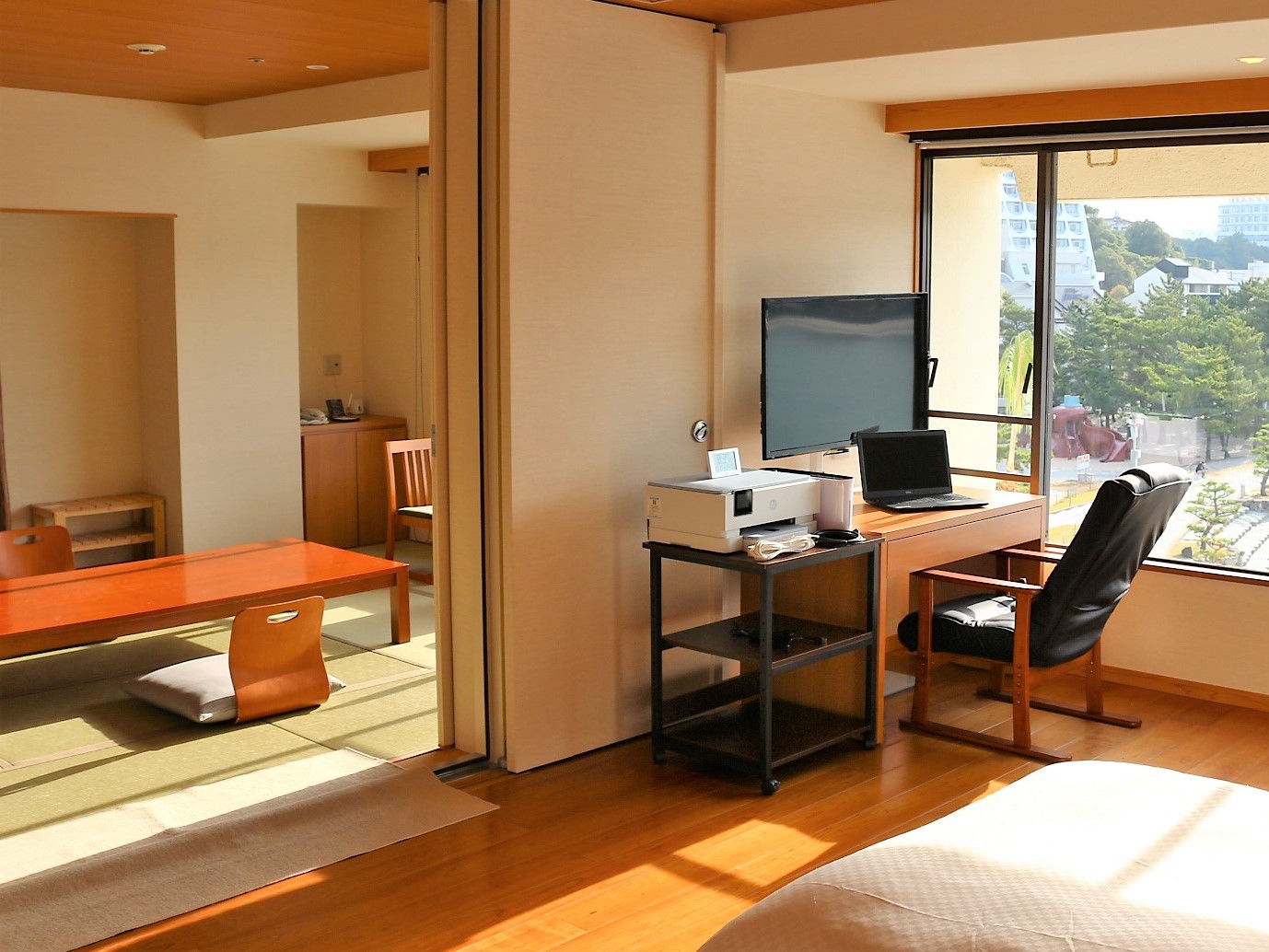 お部屋はコネクティングルームの和洋室を活用しており、洋室をワークルームに、和室をご休憩やご家族のお部屋として使い分けていただけます。