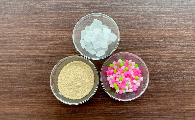 - 氷砂糖、きび砂糖、金平糖から2種類の砂糖を選びます。