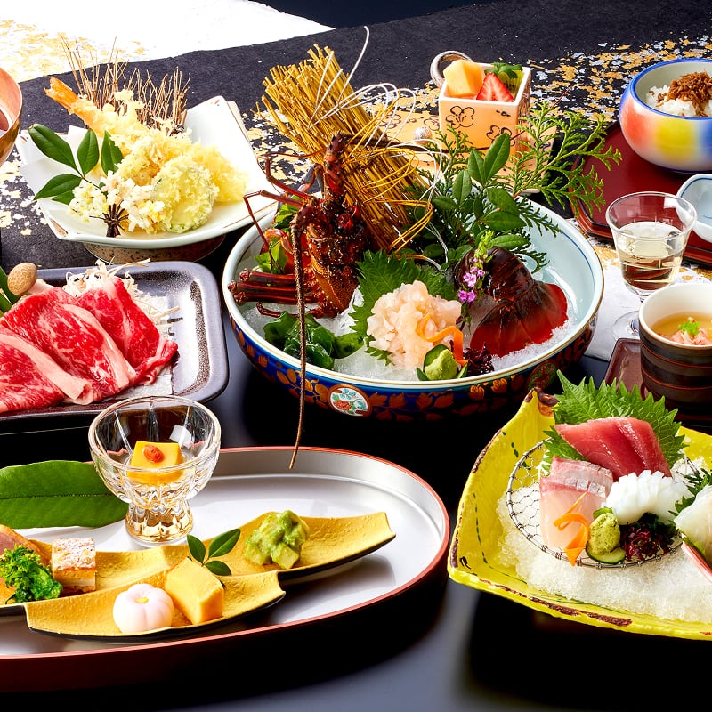 お祝いの鯛料理と「風雅会席」をご用意いたします。風雅会席は、イセエビ料理や牛肉料理などを含む全12品です。イセエビは焼きや煮など、お好みの調理方法をお一人ずつお選びいただけます。
