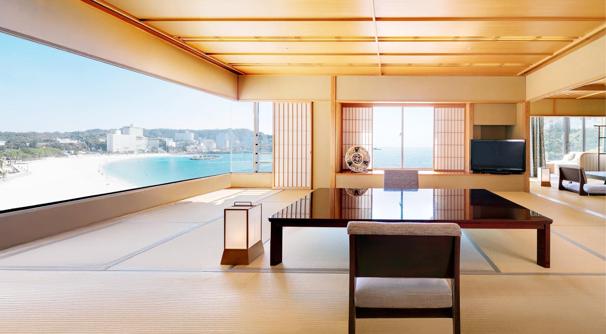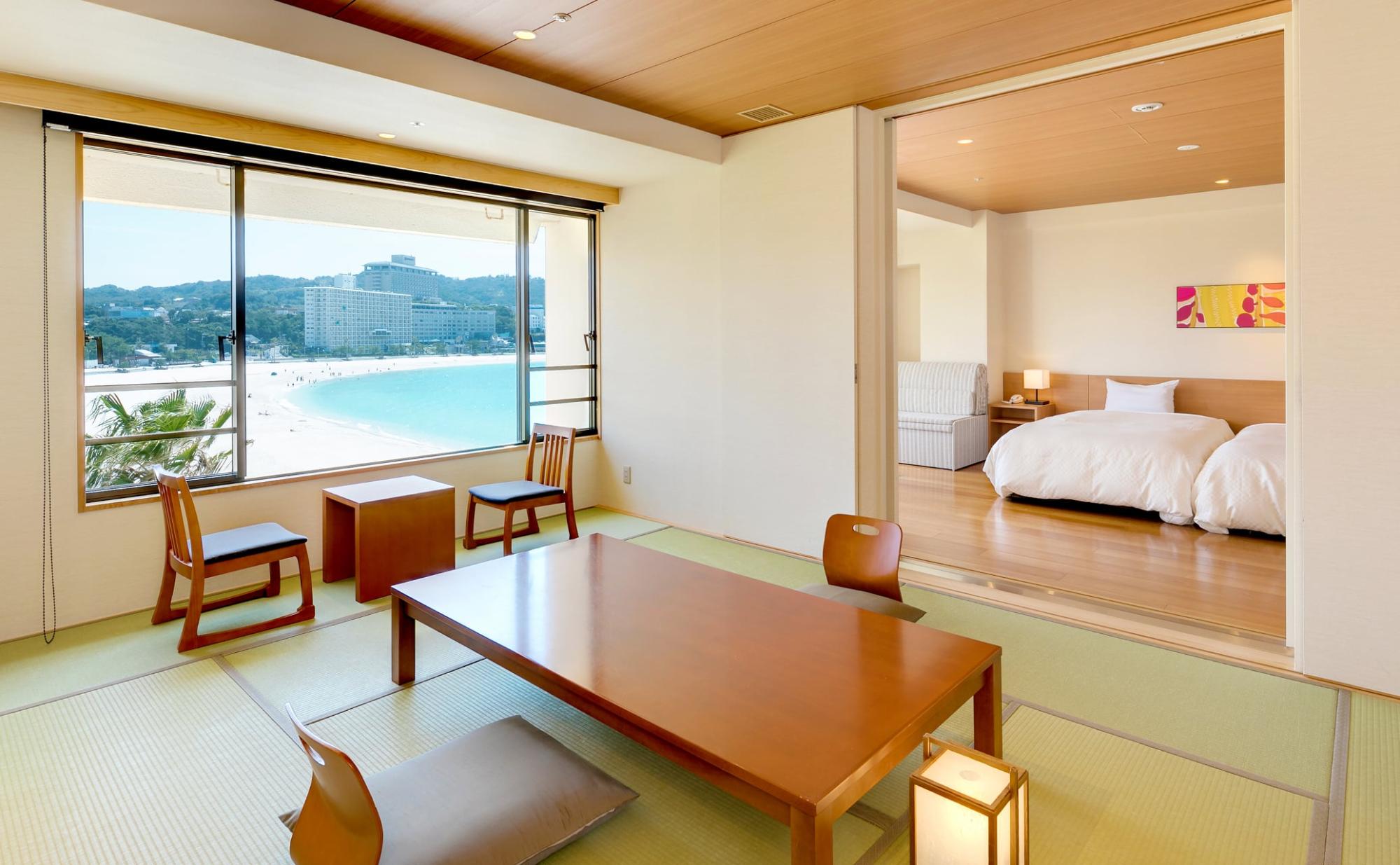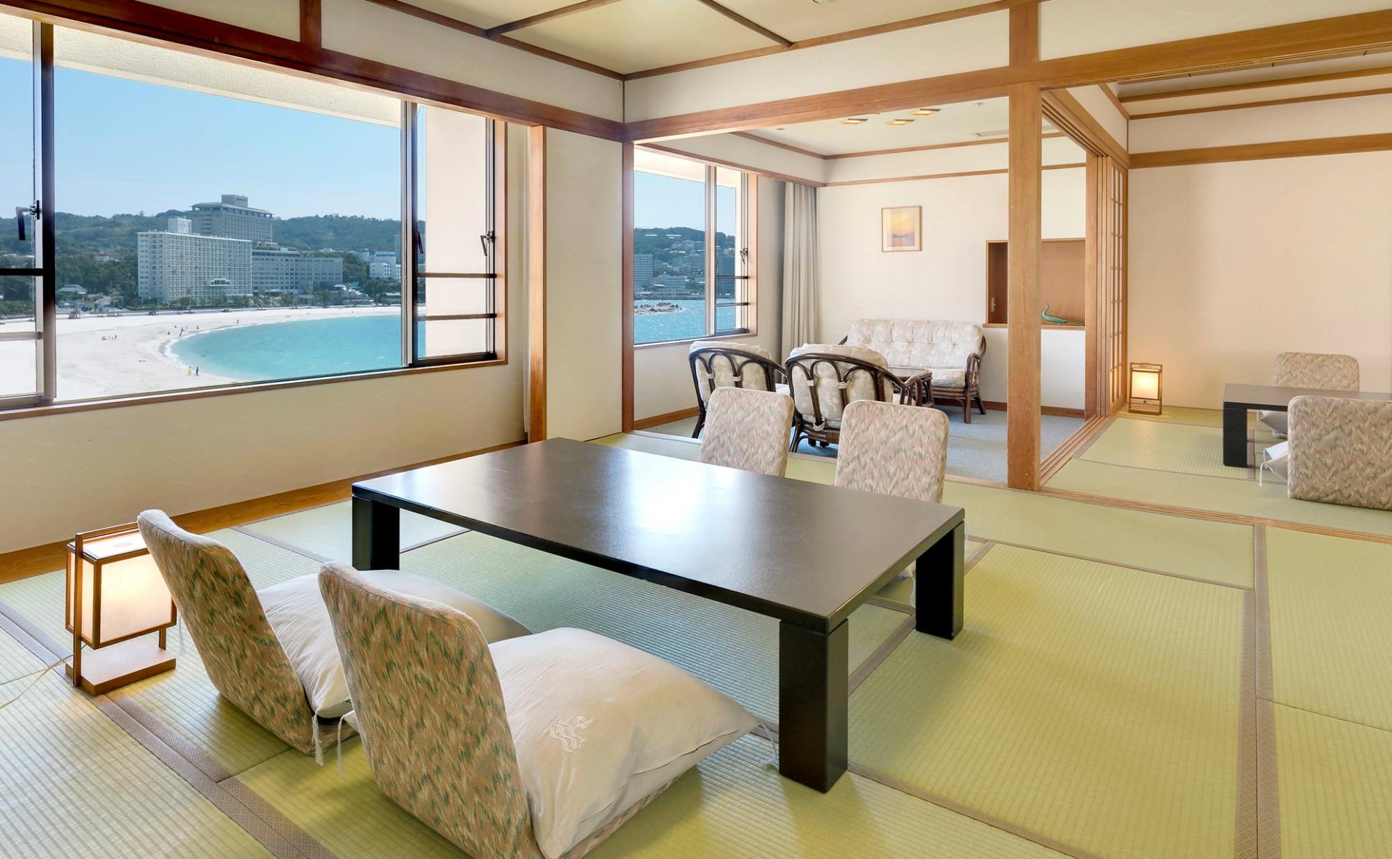 ゆとりのある空間にリビング・6畳スペース・ベッドルームを備え、白良浜と海の景色を一望できるお部屋です。