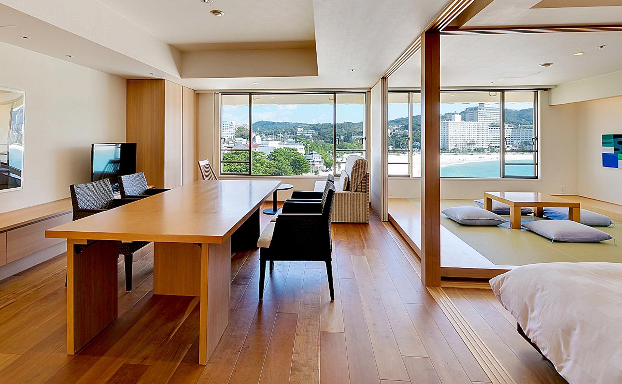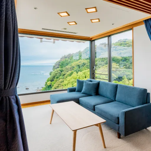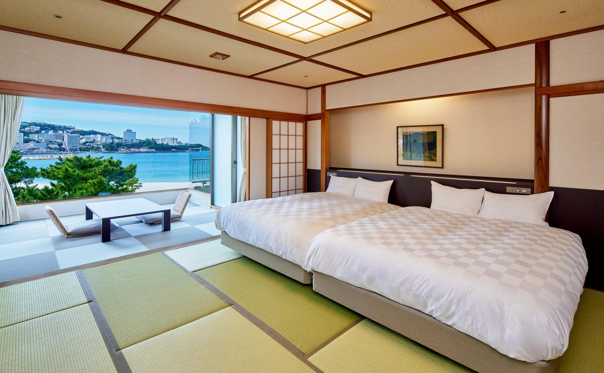 ゆとりのある空間にリビング・6畳スペース・ベッドルームを備え、白良浜と海の景色を一望できるお部屋です。