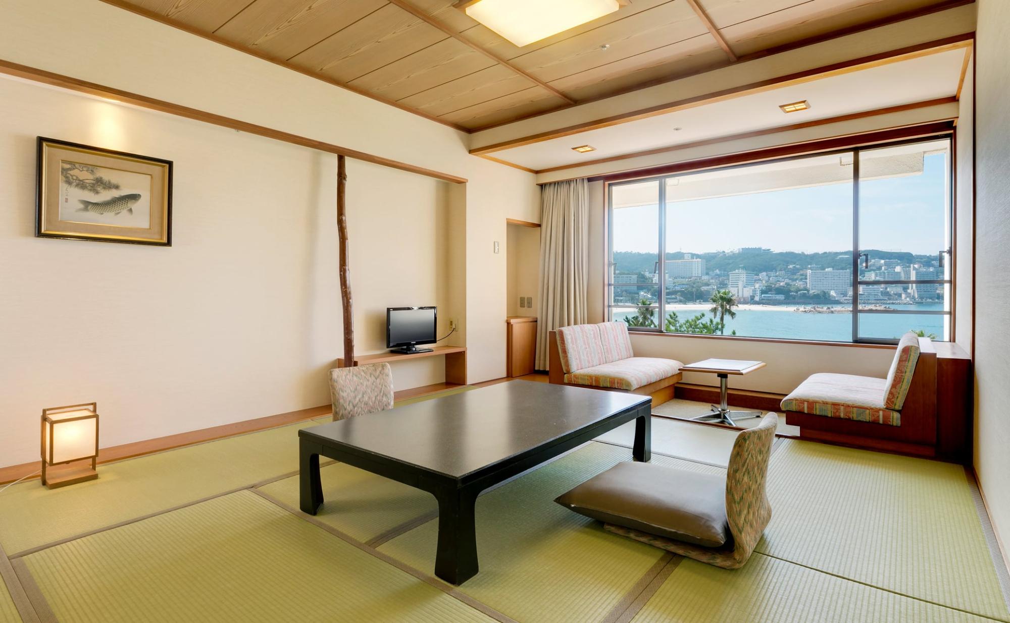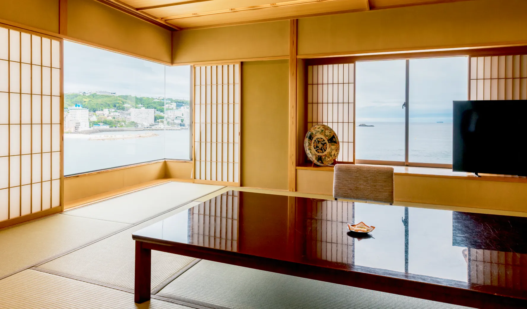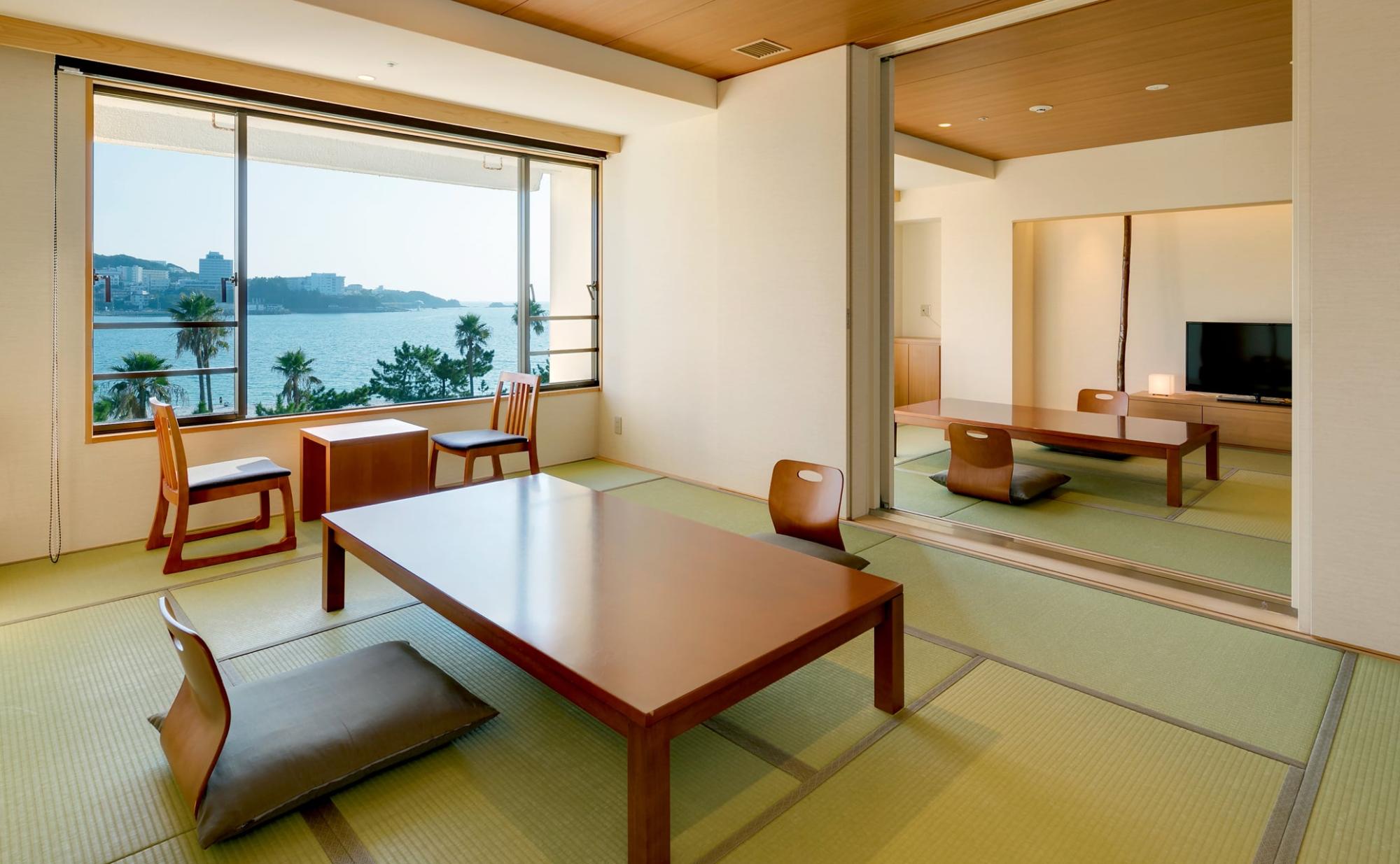 窓の面積を大きくとった二間続きの和室で、水平線まで海の景色を愉しめるお部屋です。