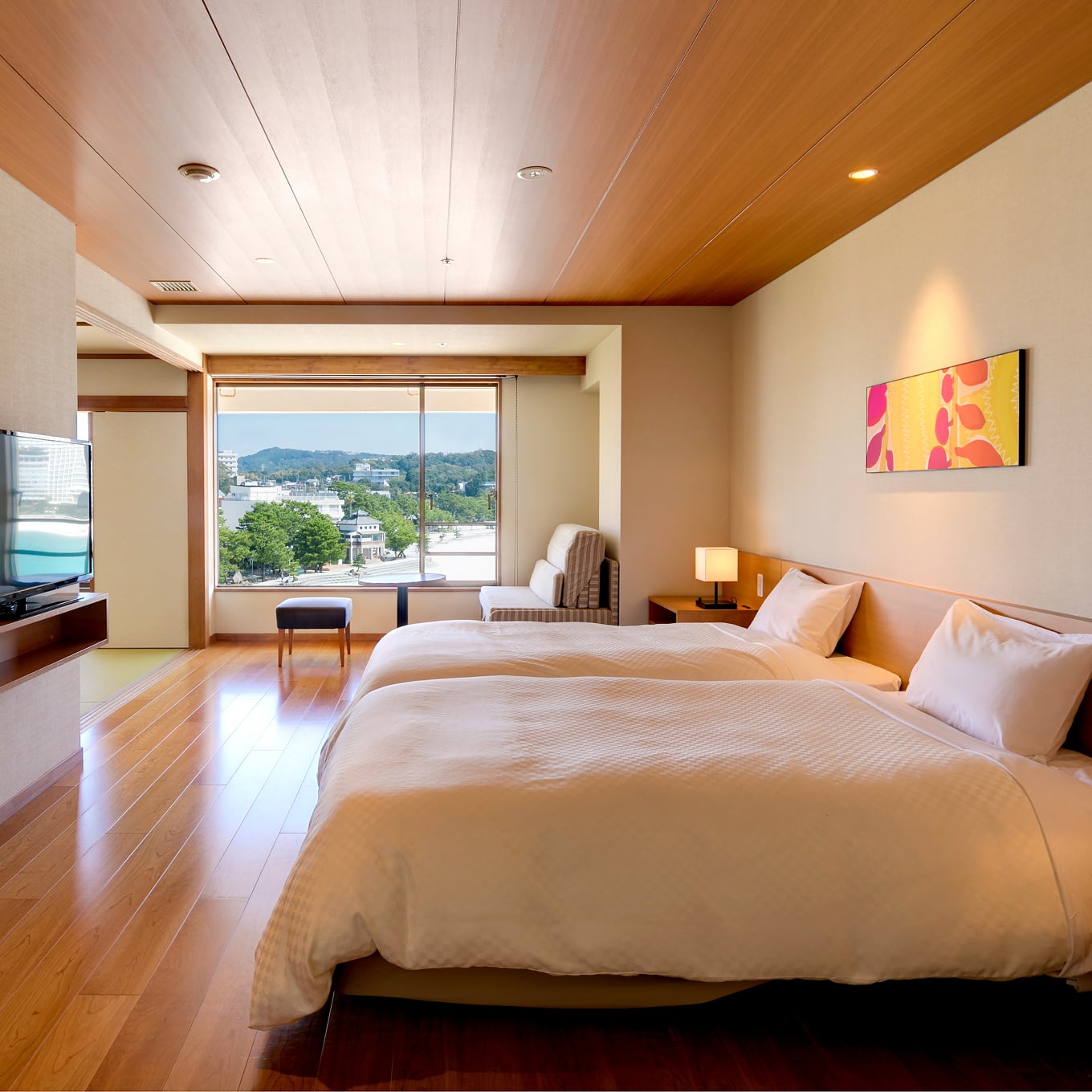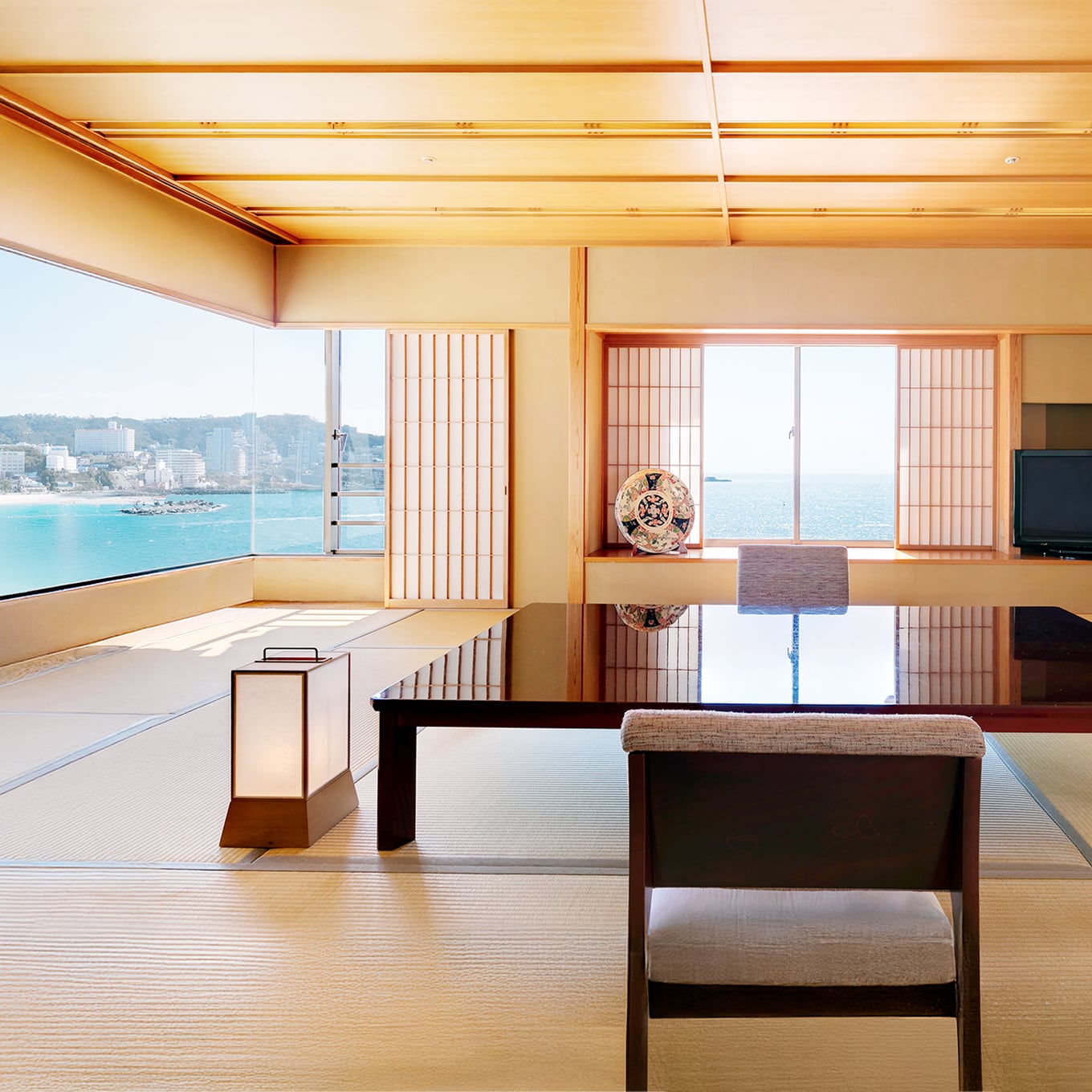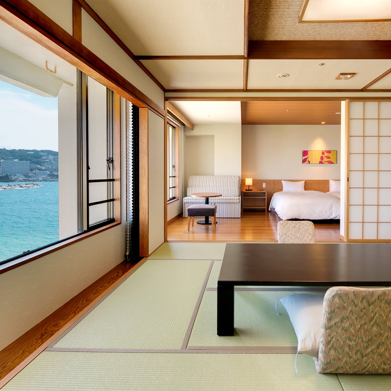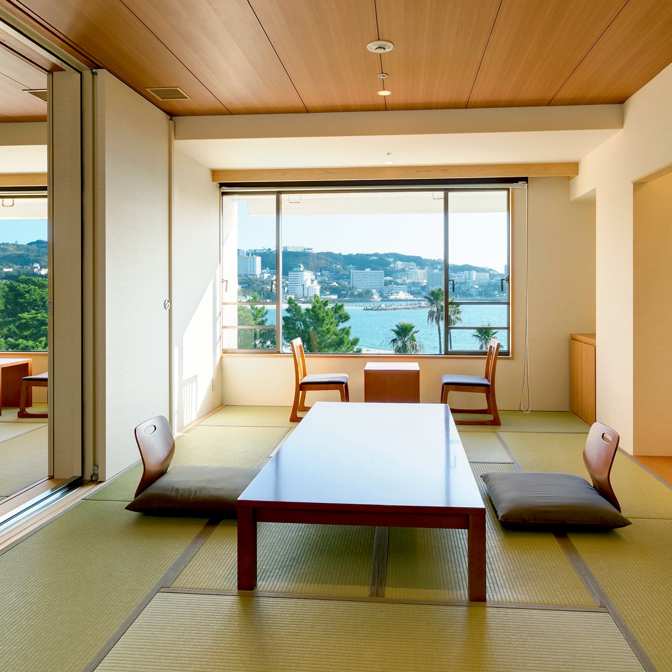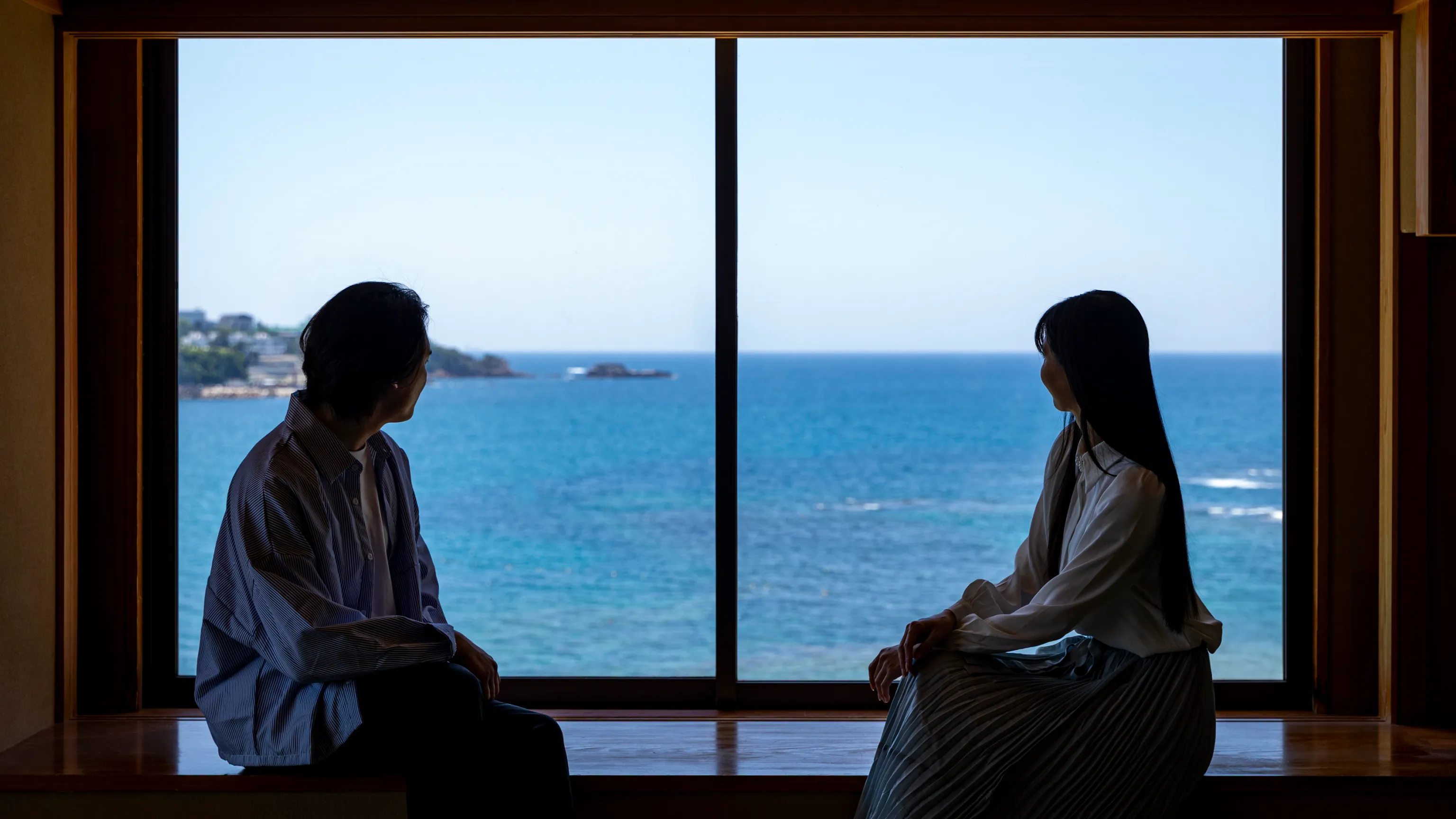 窓の面積を大きくとった二間続きの和室で、水平線まで海の景色を愉しめるお部屋です。