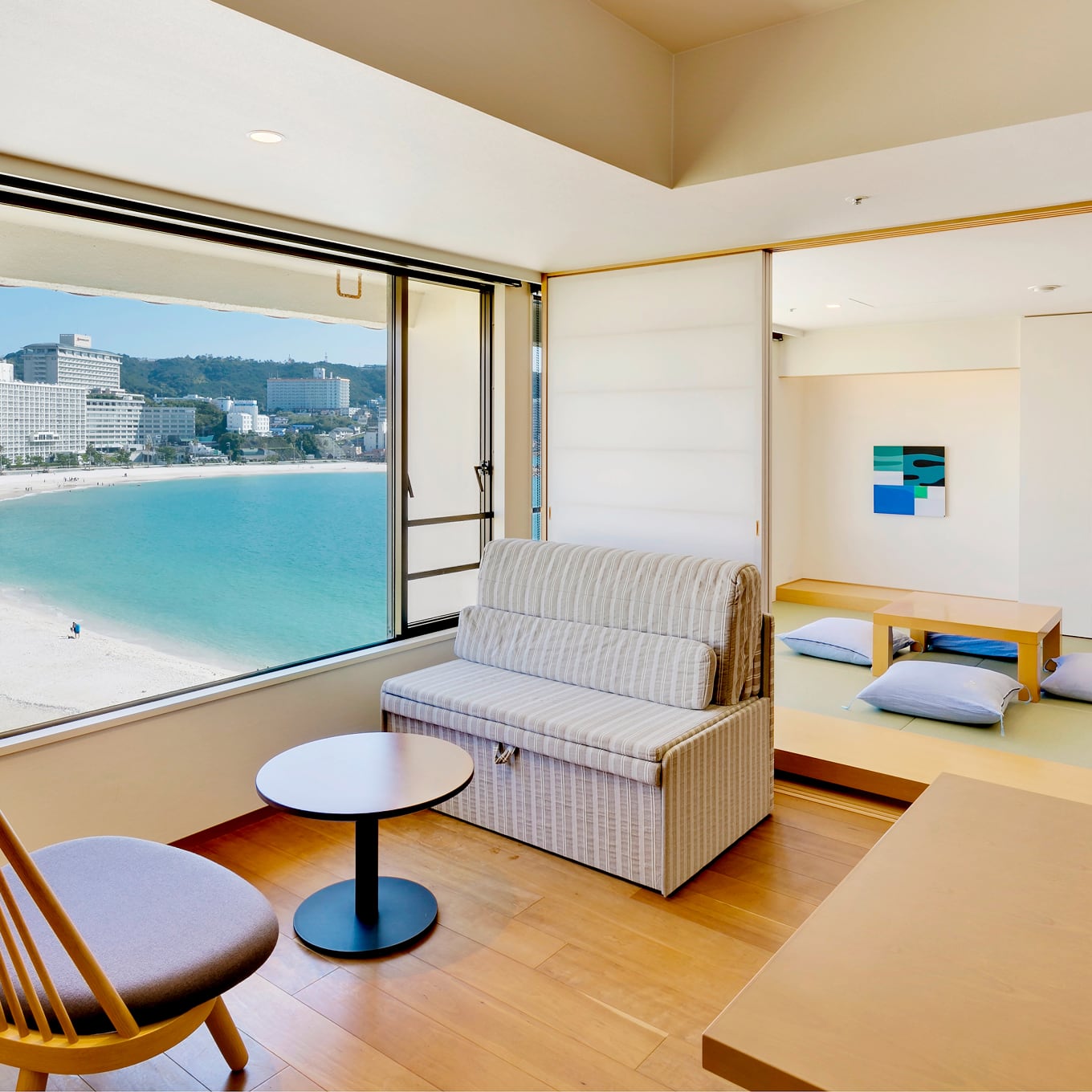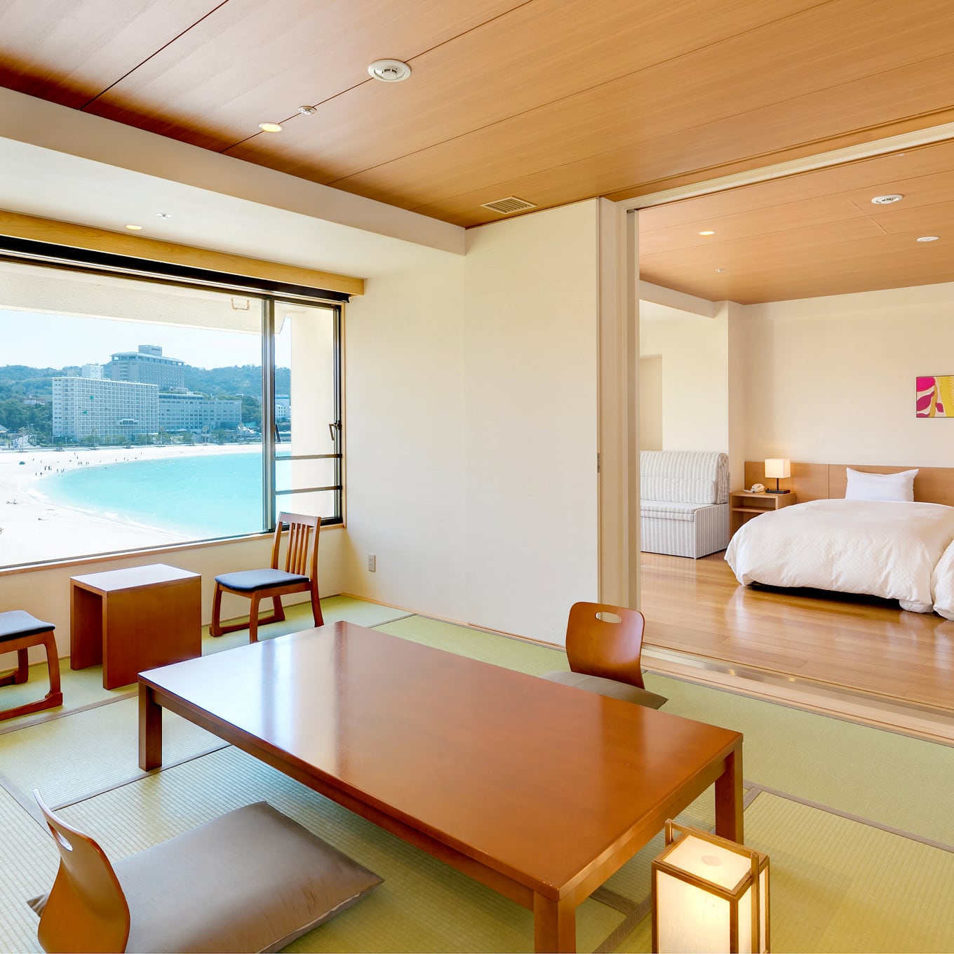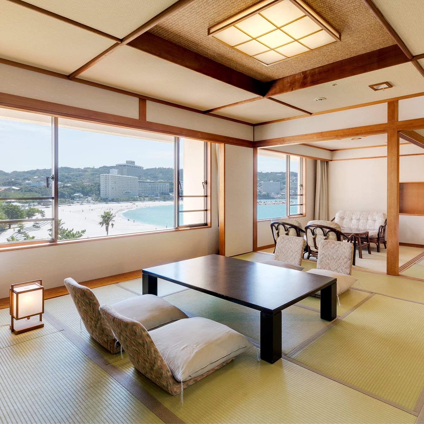 ゆとりのある空間にリビング・6畳スペース・ベッドルームを備え、白良浜と海の景色を一望できるお部屋です。