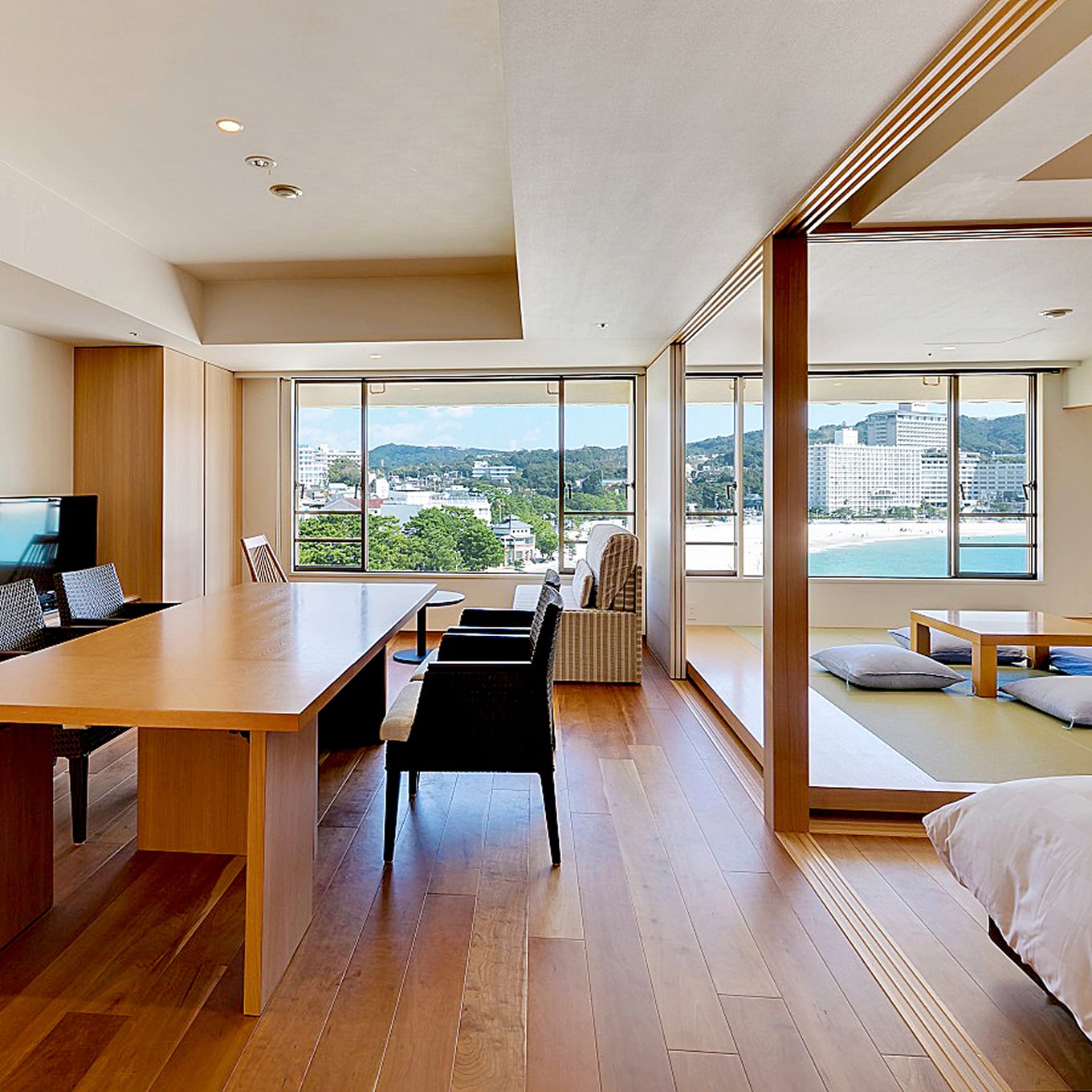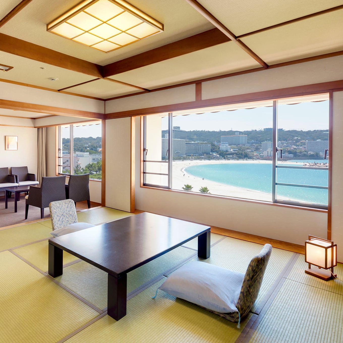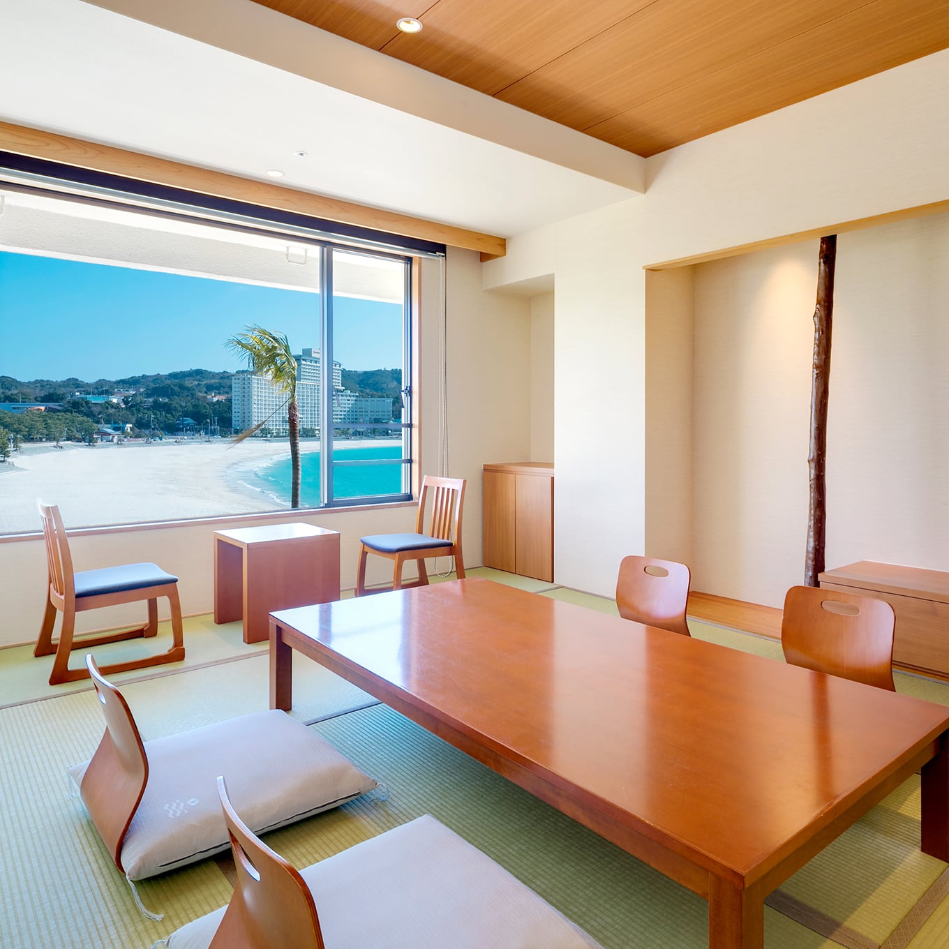 ゆとりのある空間にリビング・6畳スペース・ベッドルームを備え、白良浜と海の景色を一望できるお部屋です。