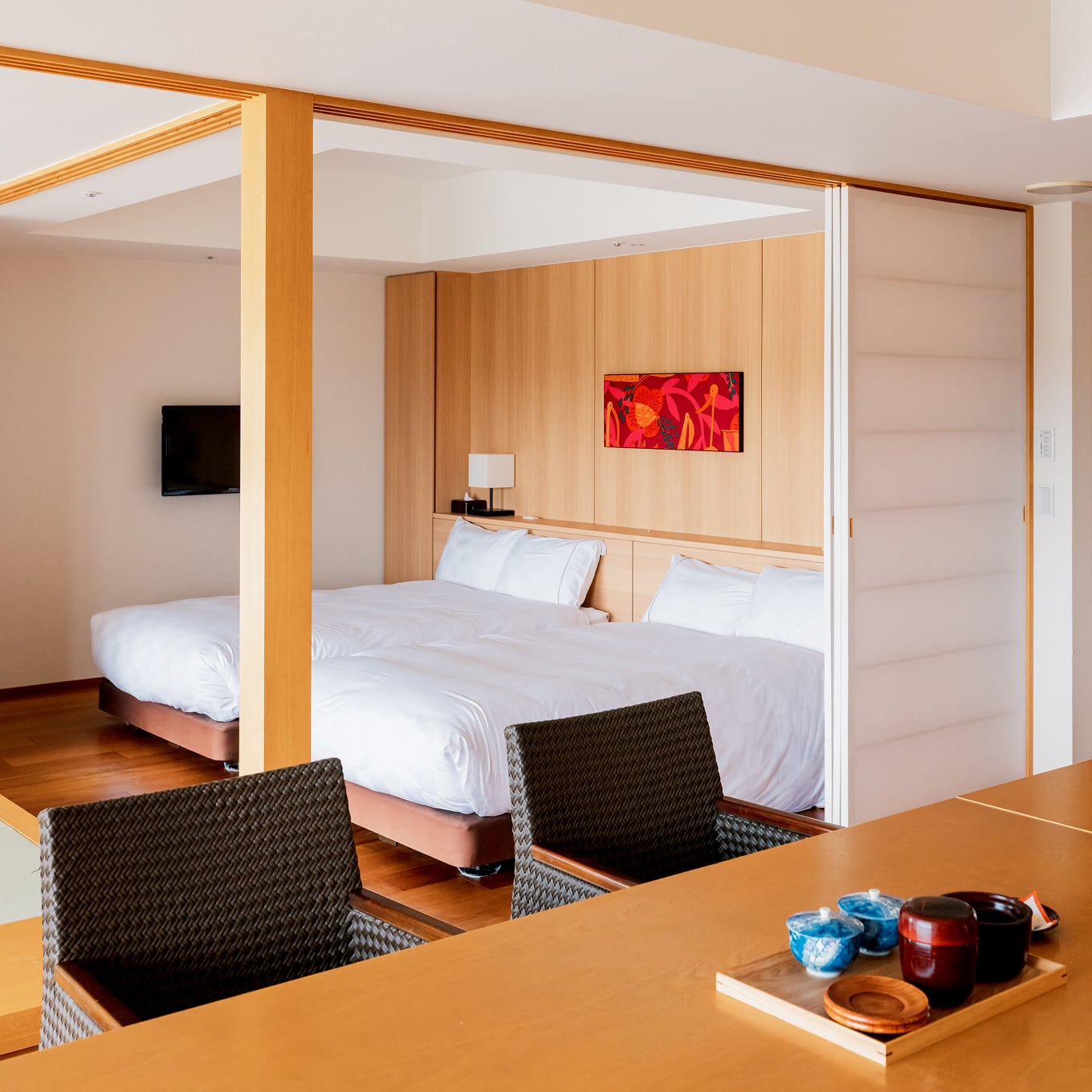 和室と洋室の間を扉で完全に仕切ることができるお部屋です。グループ旅行や2世帯、3世帯での滞在におすすめです。
