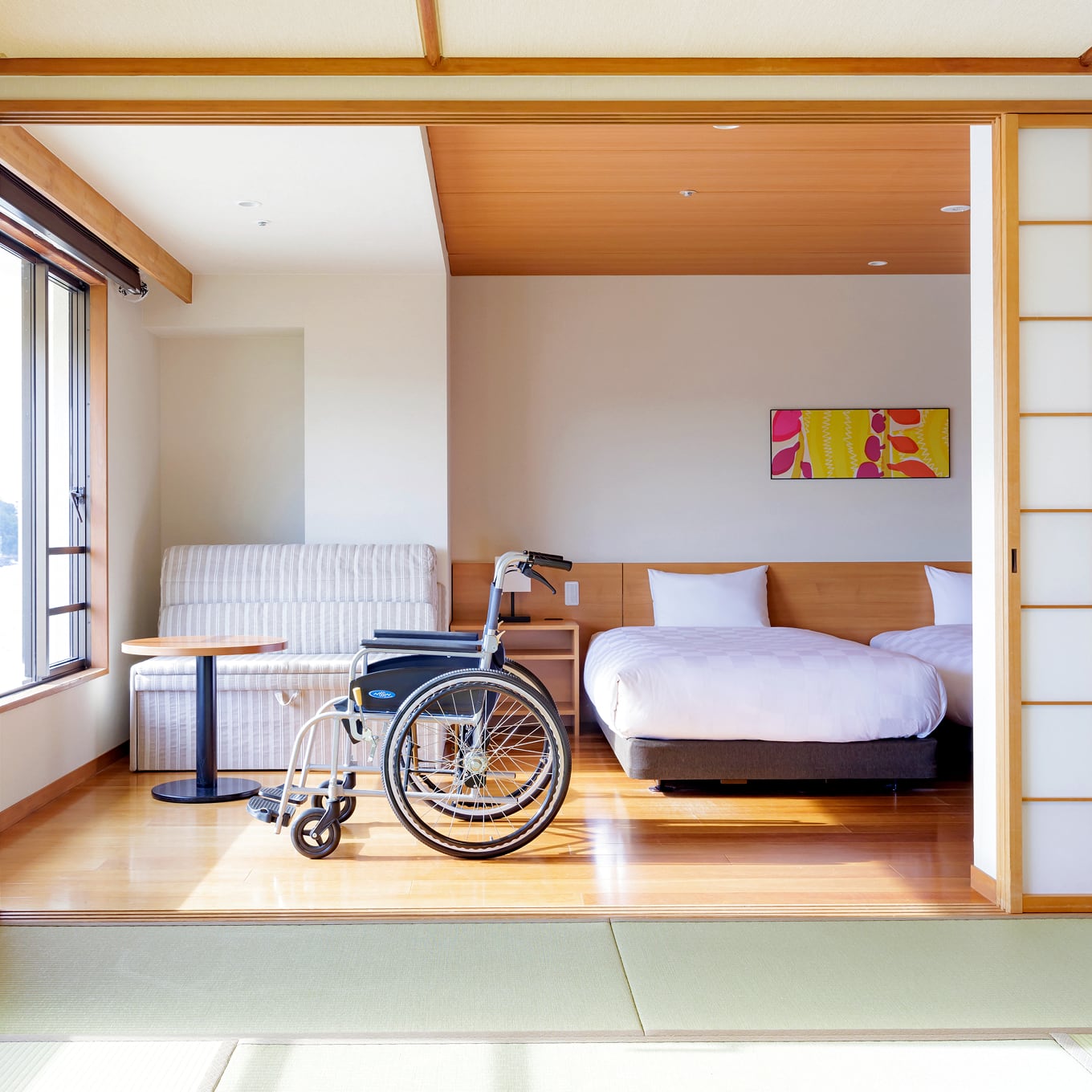 客室内に段差がなく、内風呂・トイレは手すり付きです。車いすで快適にお過ごしいただけるバリアフリーのお部屋です。