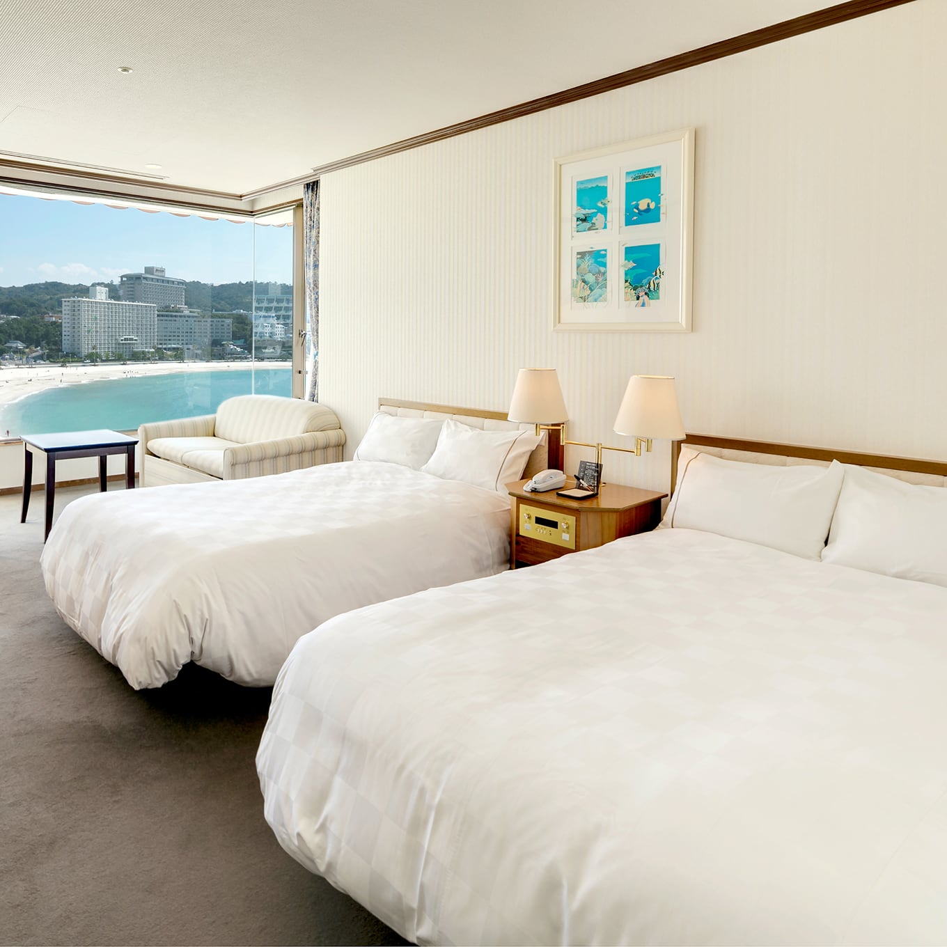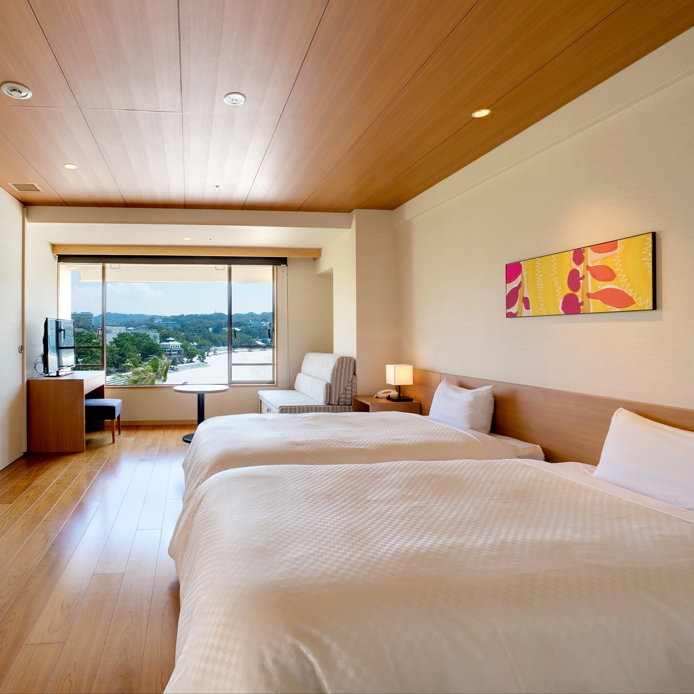 大きな窓ガラスから海の景色を愉しめる、建物の角にある1室のみのツインルームです。