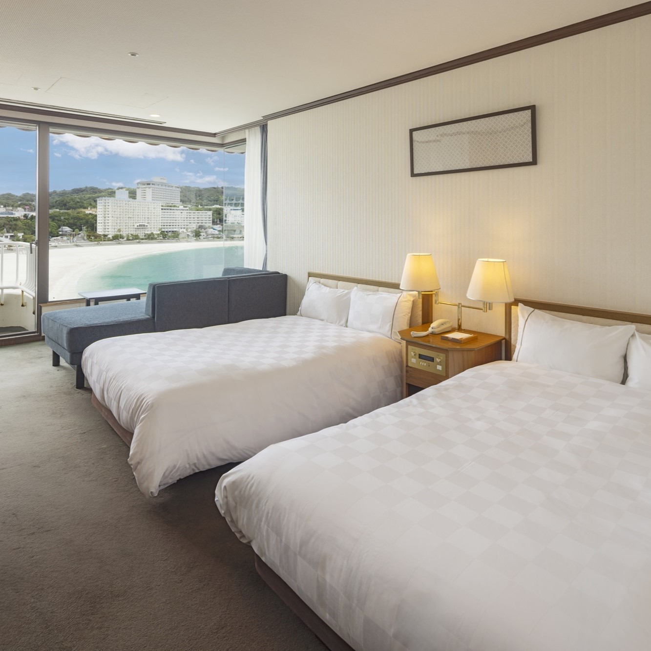 ゆとりのある空間にリビング・6畳スペース・ベッドルームを備え、白良浜と海の景色を一望できるお部屋です。