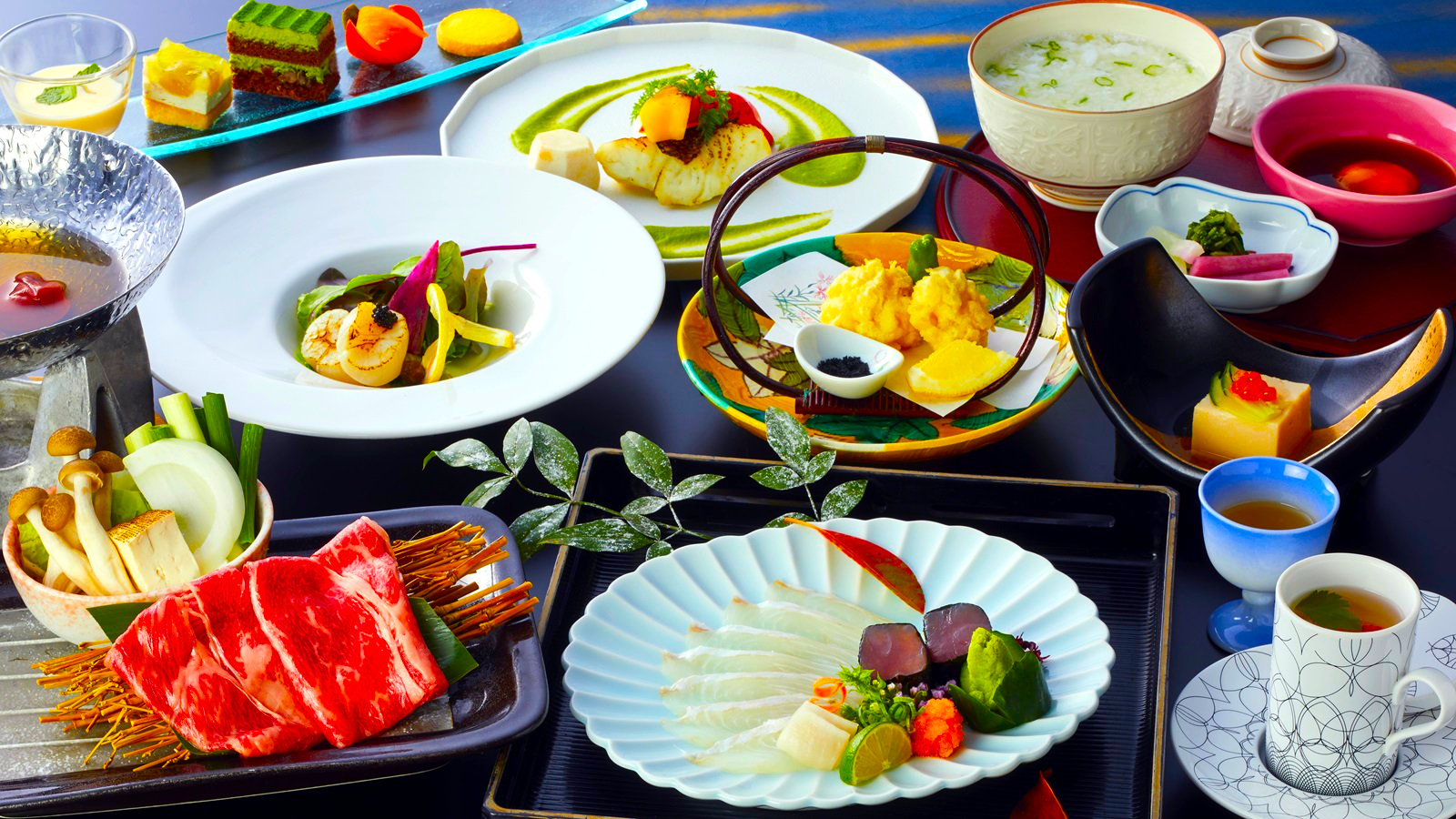 白良荘グランドホテルの定番夕食会席。調理長が紀州地域をはじめ、各地の食材を厳選し、腕によりをかけて調理した会席料理です。メニューは四季折々で変わります。目にも愉しくおいしい山海の旬の幸をご賞味ください。