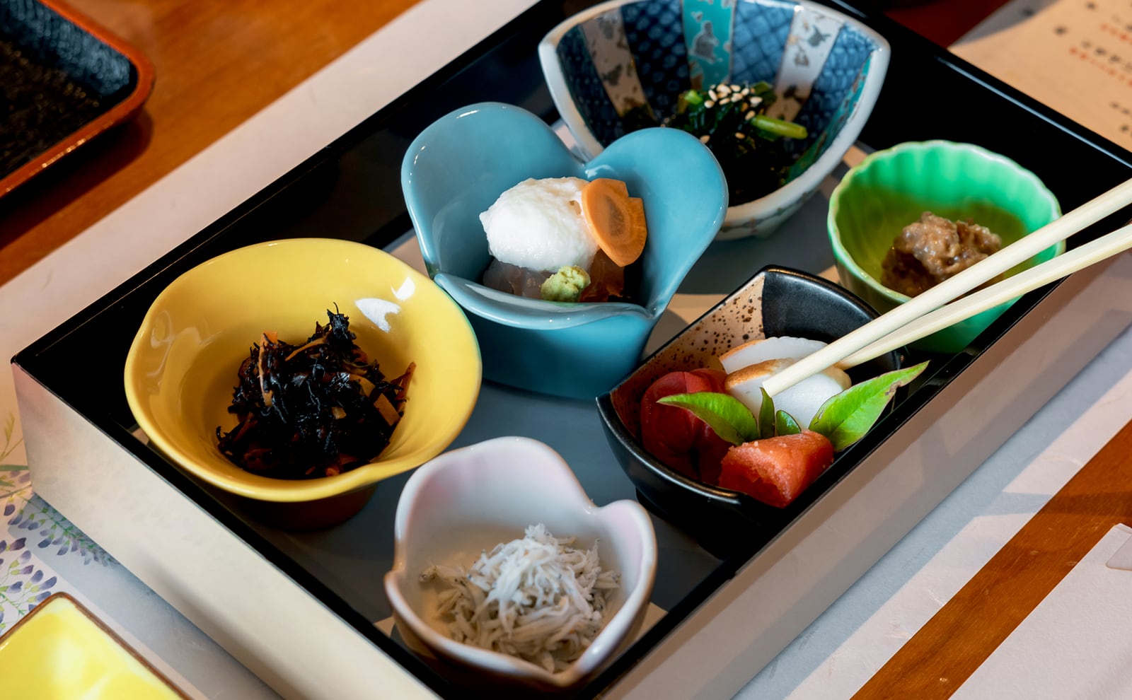 オリジナルの白良鍋やイセエビ出汁の味噌汁をはじめ、素材の持ち味を最大限に引き出す出汁にこだわり抜いた料理の数々。海の幸や野菜、和歌山県産の食材を採り入れた和のお食事をご用意いたします。ご飯は、白米と梅粥からお選びいただけます。