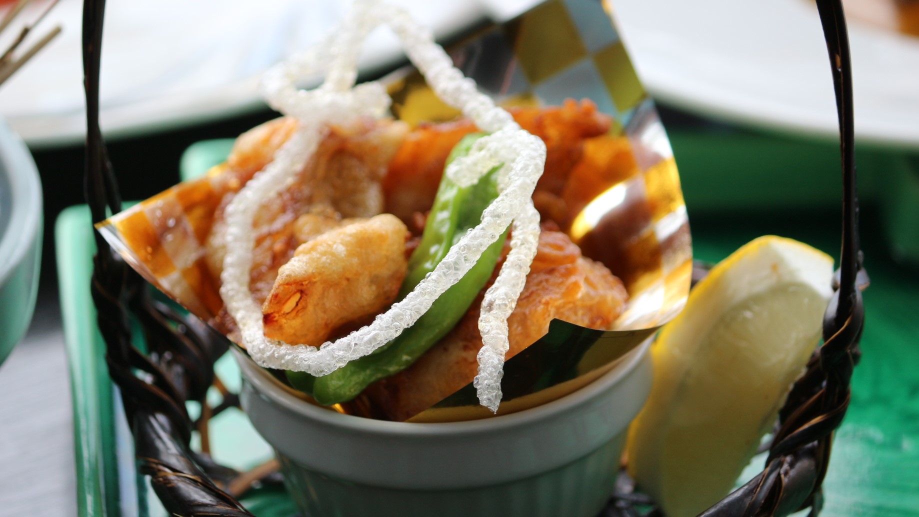 あらの骨周りのスジや身に凝縮された旨味を唐揚げにすることで脂が乗り身が引き締まった美味しさを堪能できます。皮の周りにはコラーゲン豊富なゼラチン質がたっぷり含まれており、これが揚げられることにより、心地よい食感と、独特の旨味を生み出します。また、サクサクの衣の食感が魅力的な一品です。