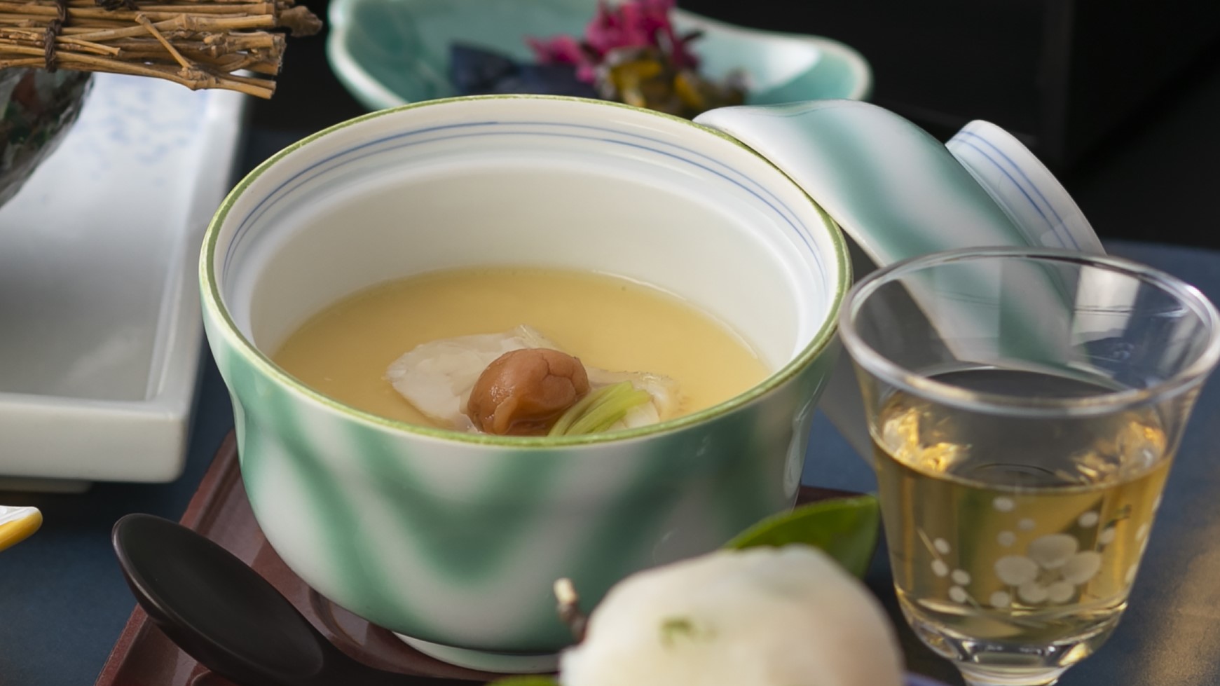 クエの上品な旨みと、香り高い柑橘系の餡が絶妙に調和する、当ホテルの会席料理を彩る一品でございます。とろけるような滑らかな口当たりと、クエの奥深い風味をご堪能いただけます。また、玉地には白玉を忍ばせておりますので、もちもちとした食感をお愉しみください。