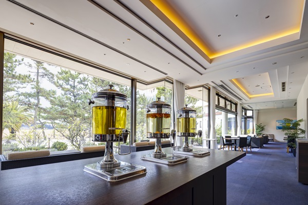 1F海辺のリゾート感が漂うラウンジでは、お飲み物と軽食を。14:30から18:00の間、ウエルカムドリンクをご用意しております。ホテルにご到着の際は、ぜひご賞味ください。夜にはイルミネーションが灯り、ゆったりとお過ごしいただけます。