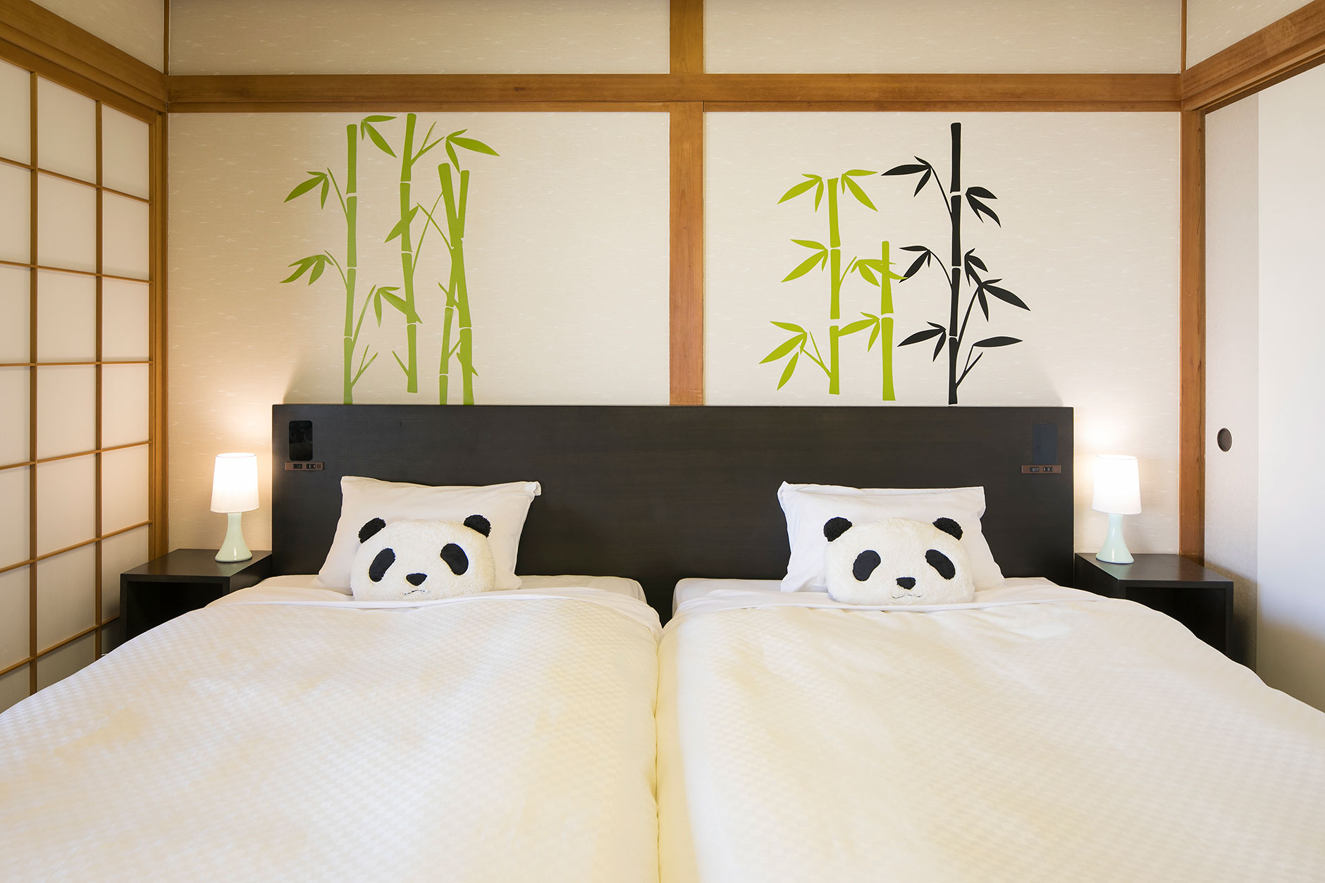 ホテルに滞在中もパンダと一緒に過ごすことができる1室限定のパンダの部屋。2間続きの和室のベッドや壁には、パンダや竹のモチーフが施されていて遊び心満載。お子さまはもちろん、大人もワクワクできるお部屋です。