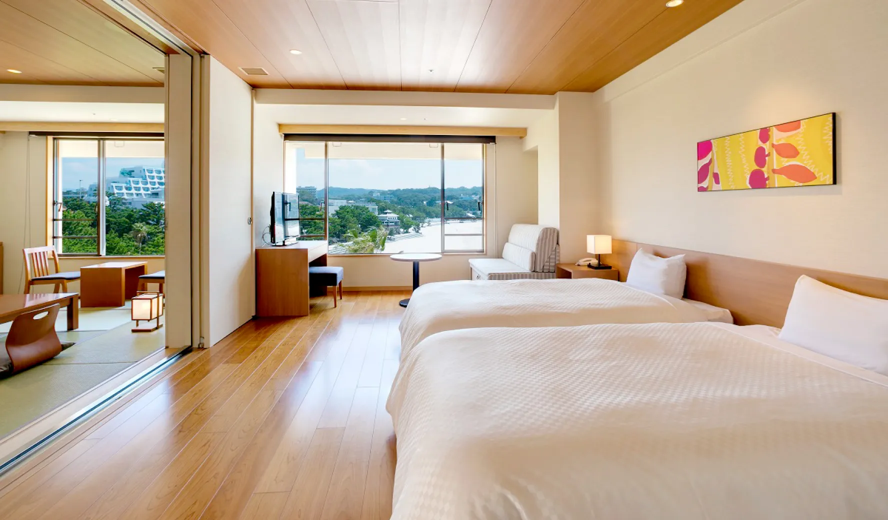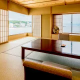 窓の面積を大きくとった二間続きの和室で、水平線まで海の景色を愉しめるお部屋です。