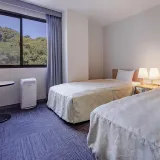 大きな窓ガラスから海の景色を愉しめる、建物の角にある1室のみのツインルームです。