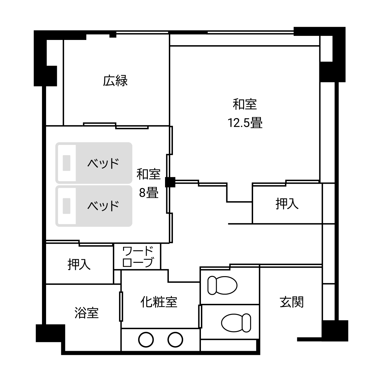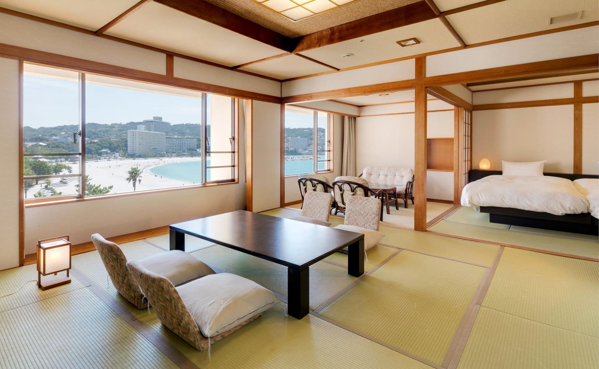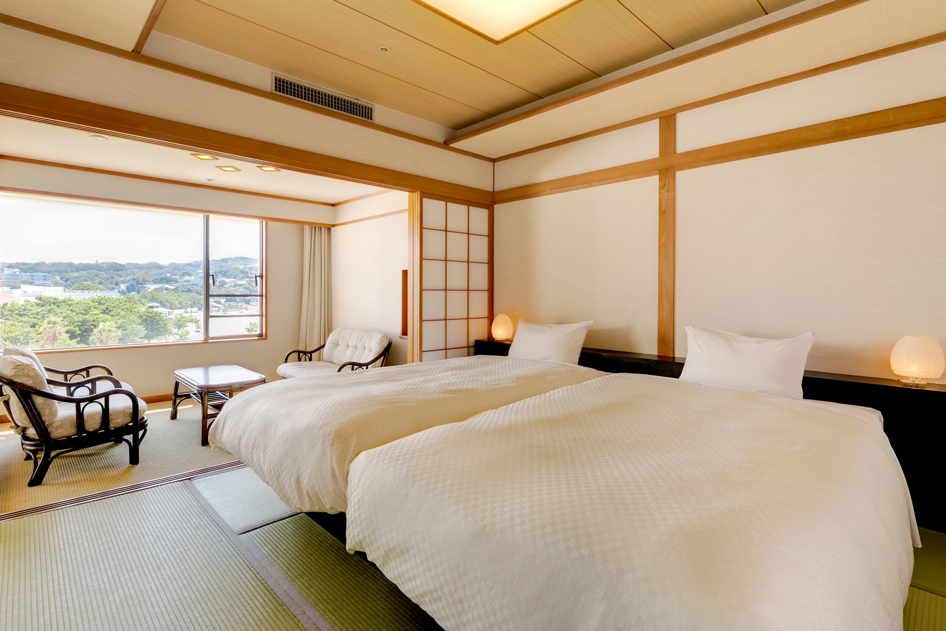 二間続きの和室にツインベッドを備えたお部屋です。畳の上でゆったりとくつろげ、就寝時にはベッドでお休みいただけます。