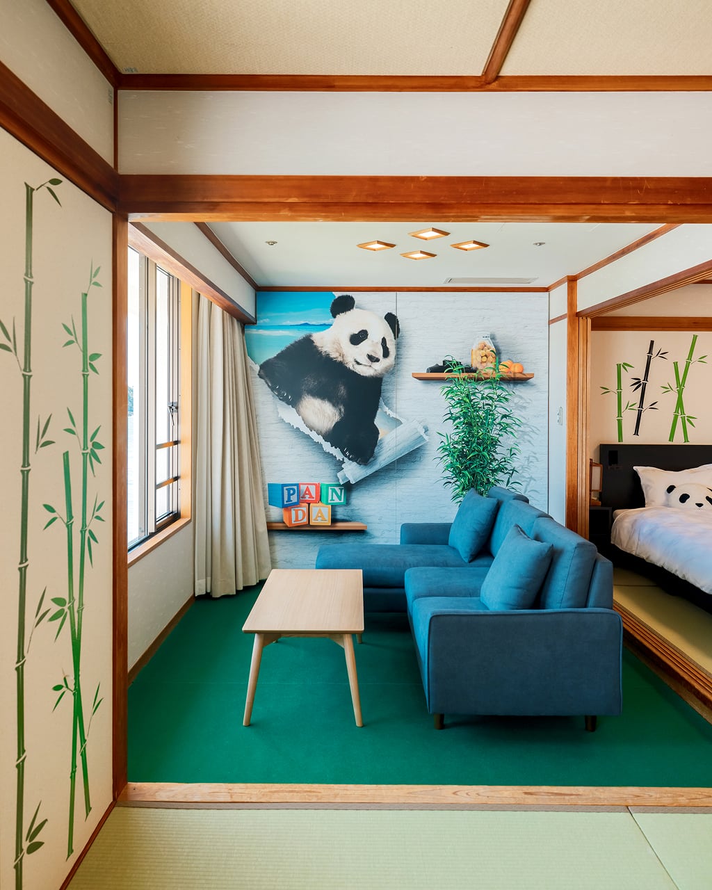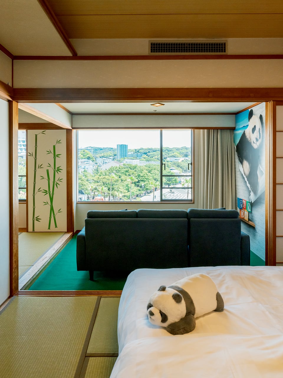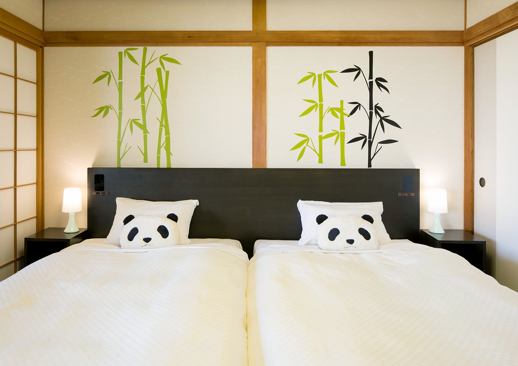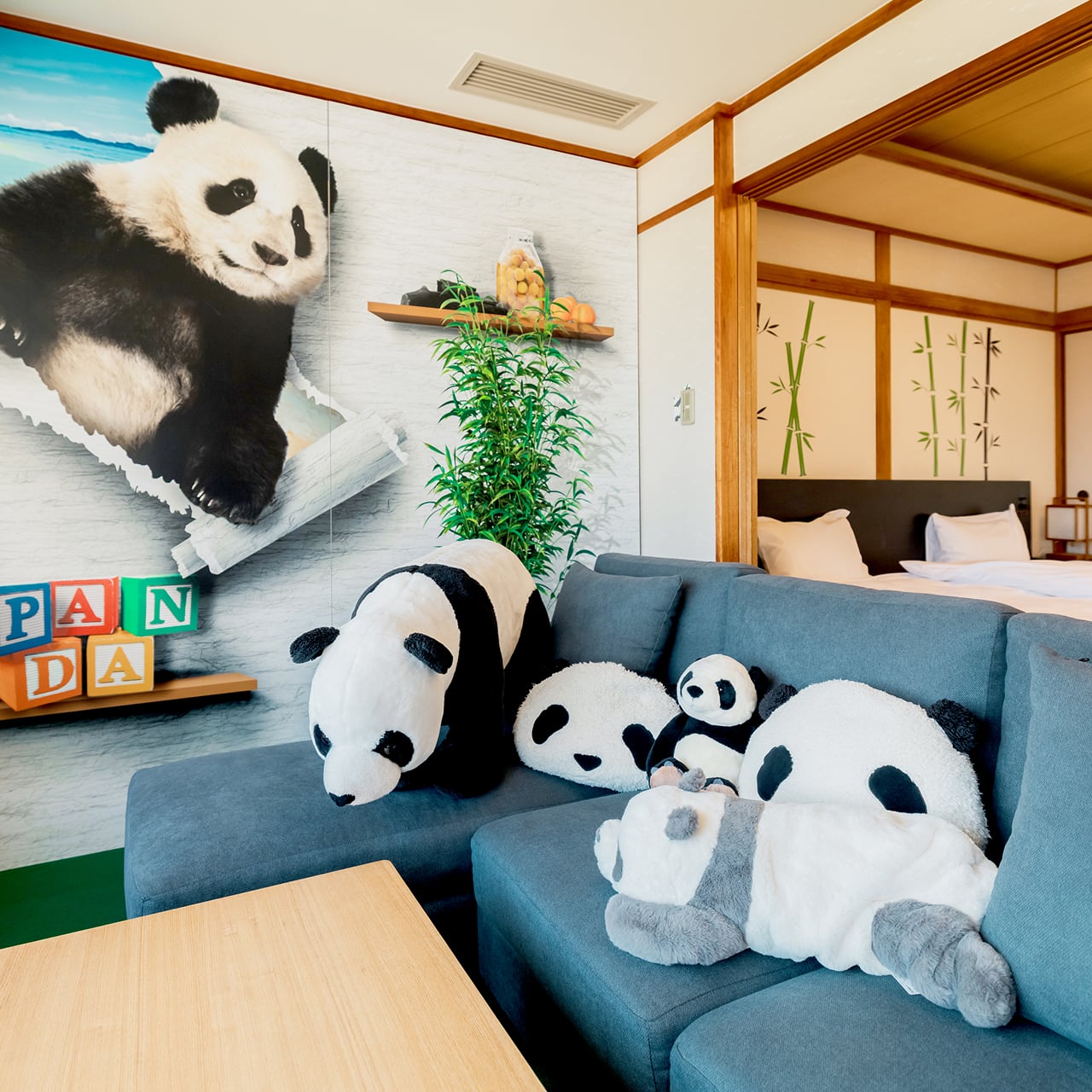 滞在中、パンダと一緒に過ごすことができる1室限定のコンセプトルームです。二間続きの和室では、ベッドや壁に施されたパンダや竹のモチーフを愉しむことができ、遊び心満載です。お子さまはもちろん、大人もワクワクできるお部屋です。