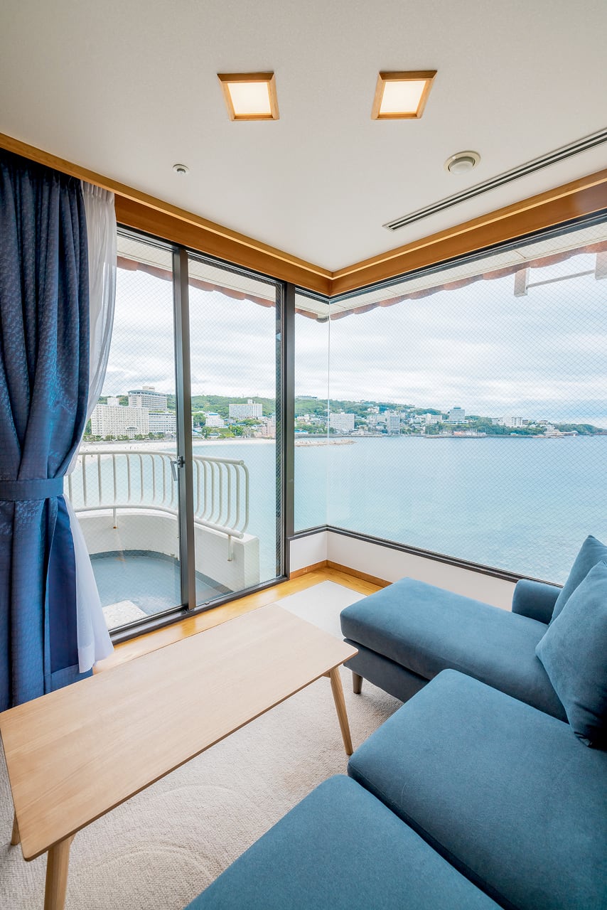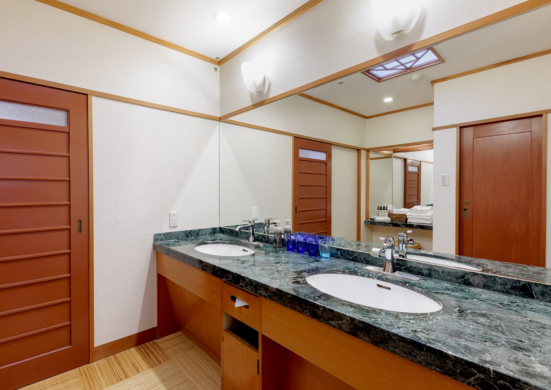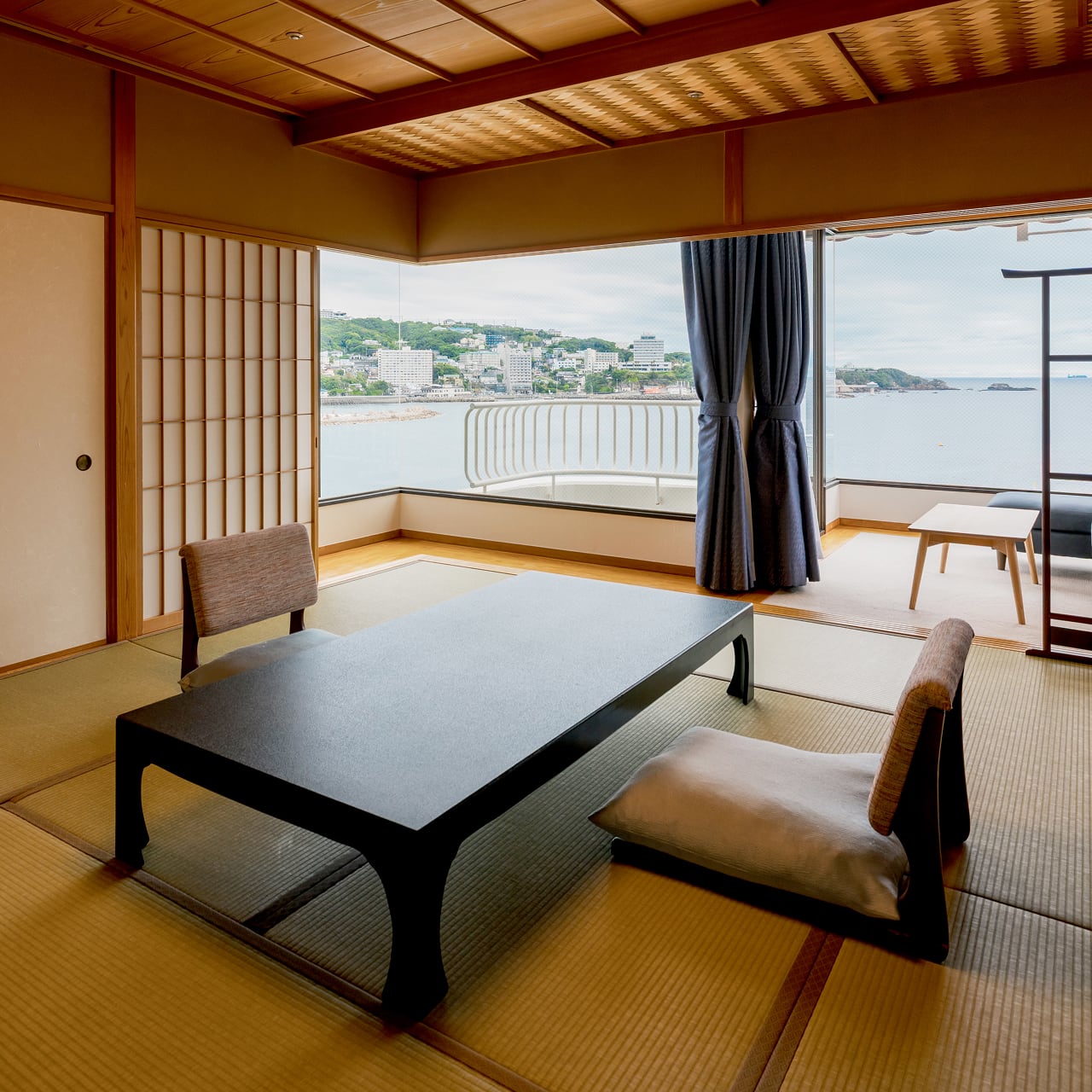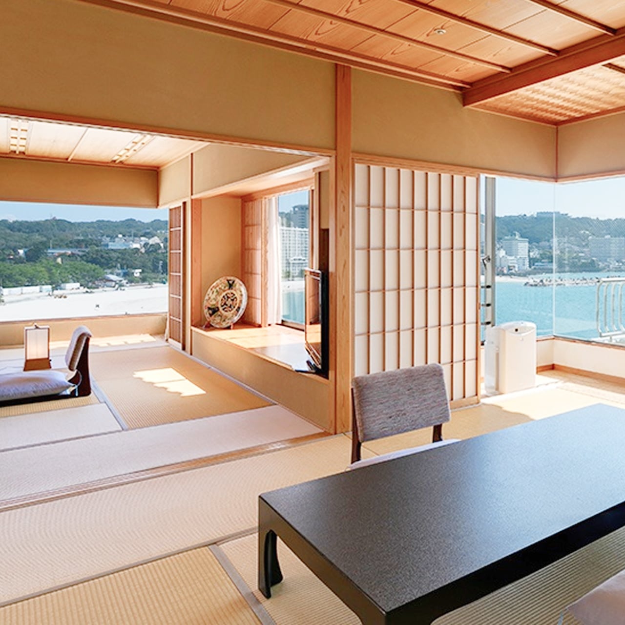 当ホテル唯一の貴賓室です。純和風の15畳間と10畳間、ソファでくつろげる応接間、どのお部屋からも、美しい海のパノラマビューをお愉しみいただけます。化粧台と浴室、お手洗は二箇所兼ね備え、ゆったりと快適にご利用いただけます。ぜひ特別な日に、大切な方と。