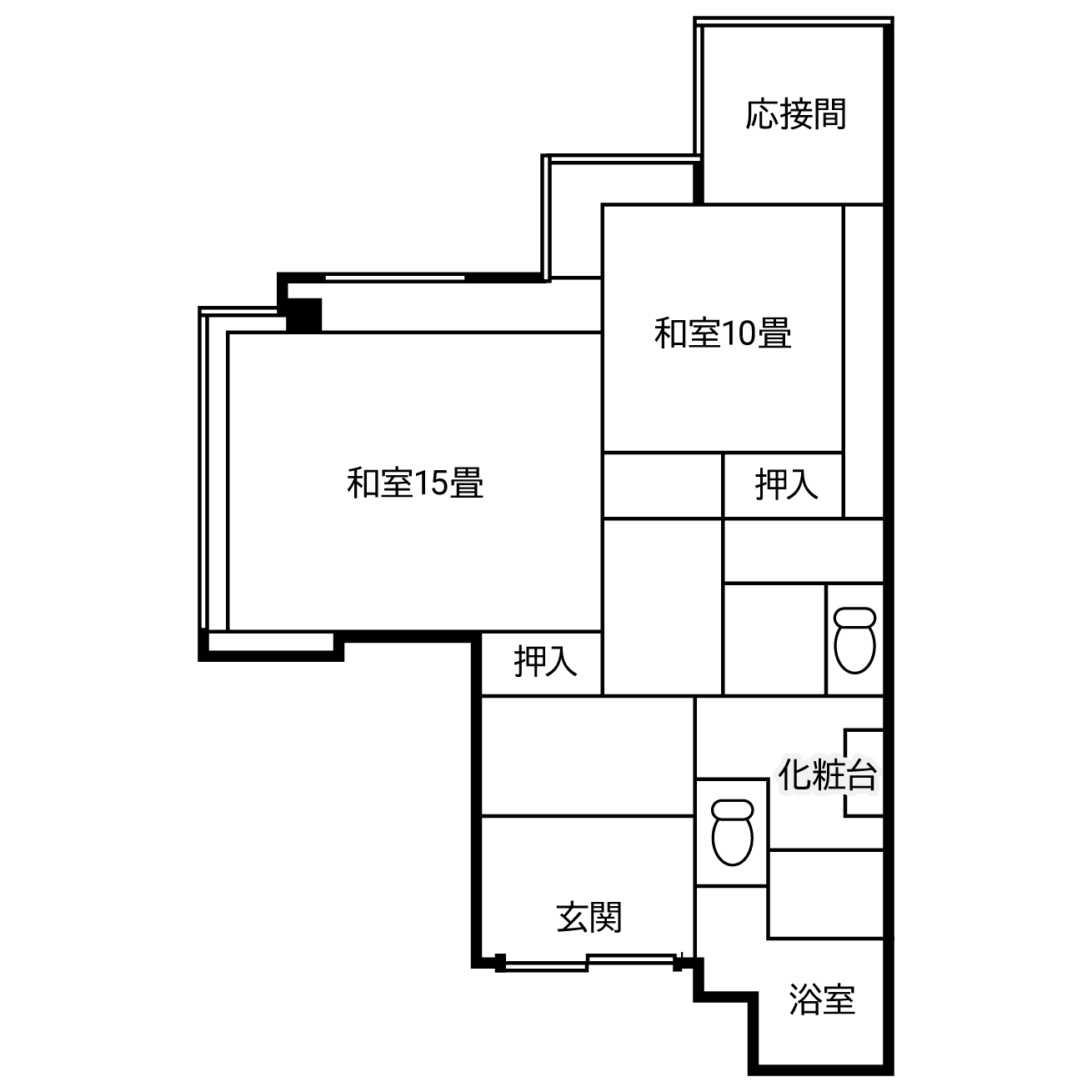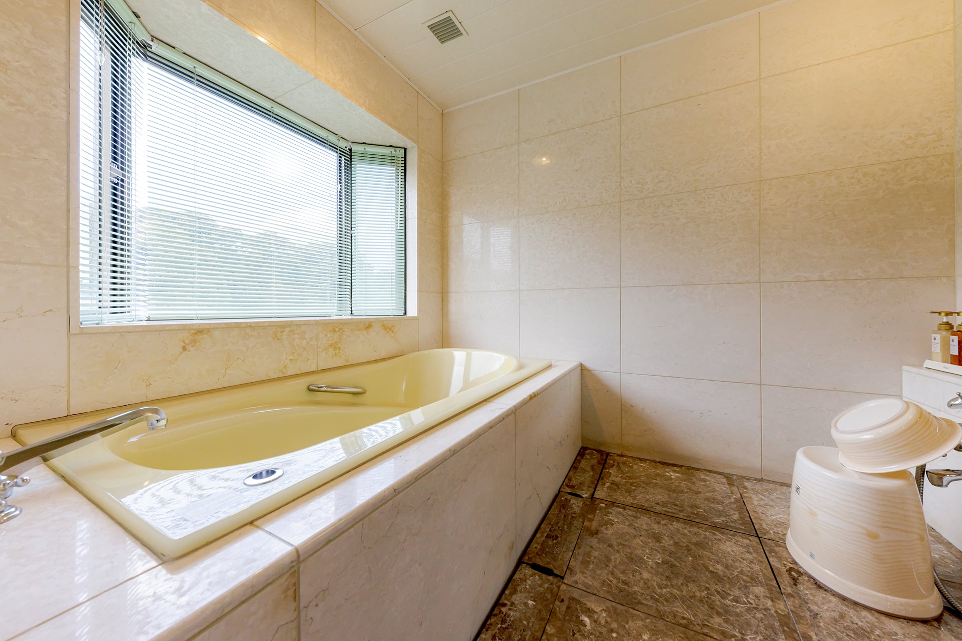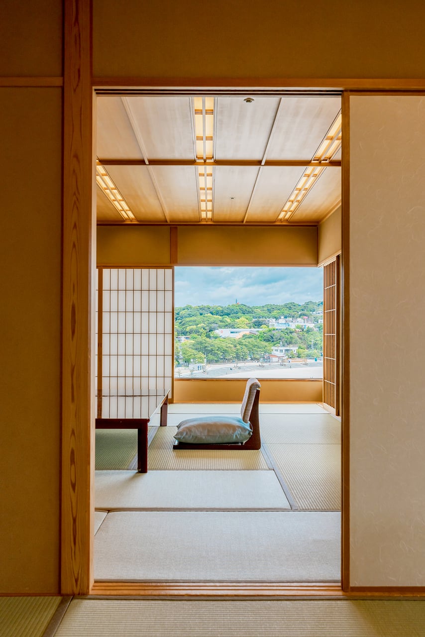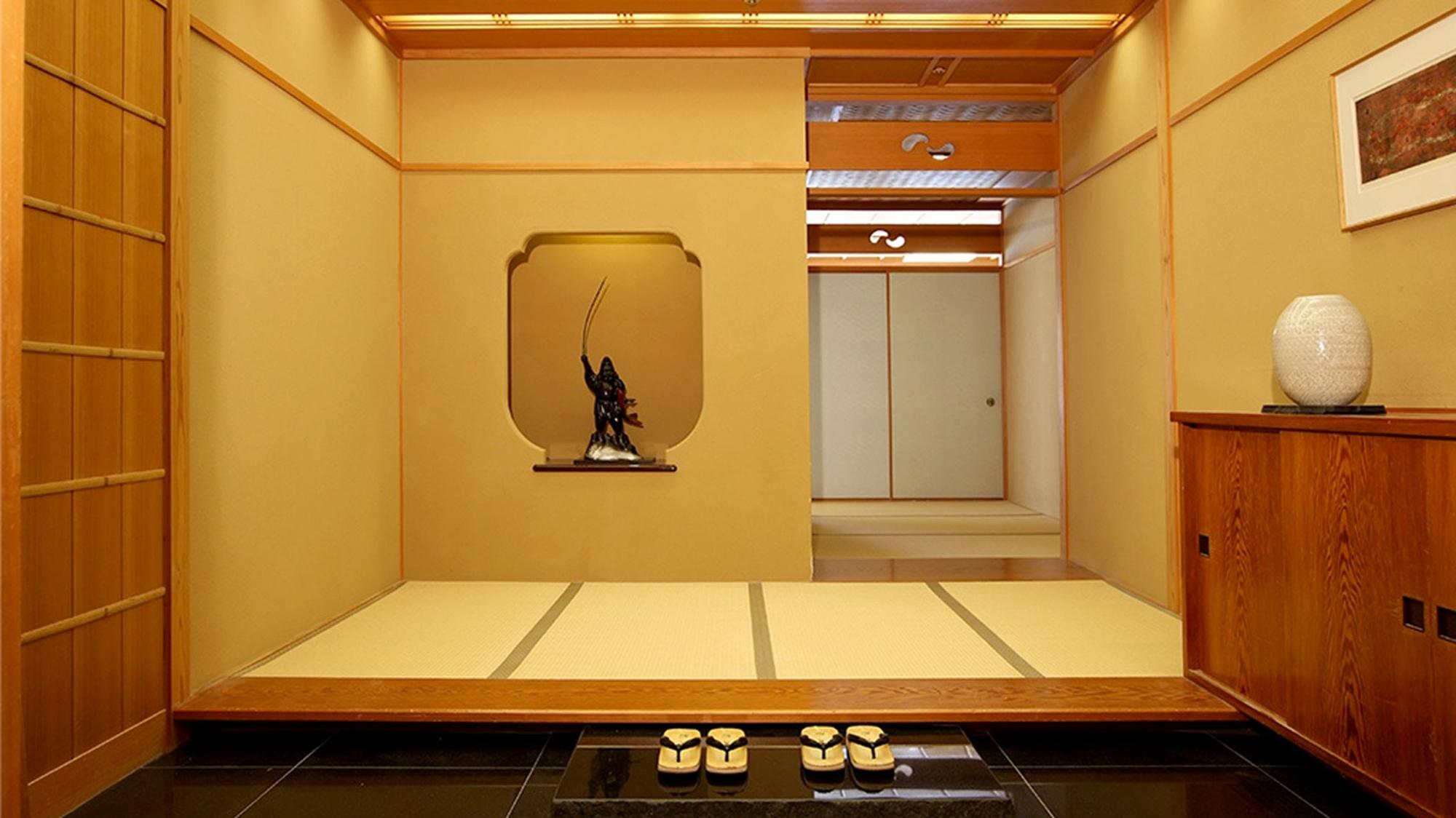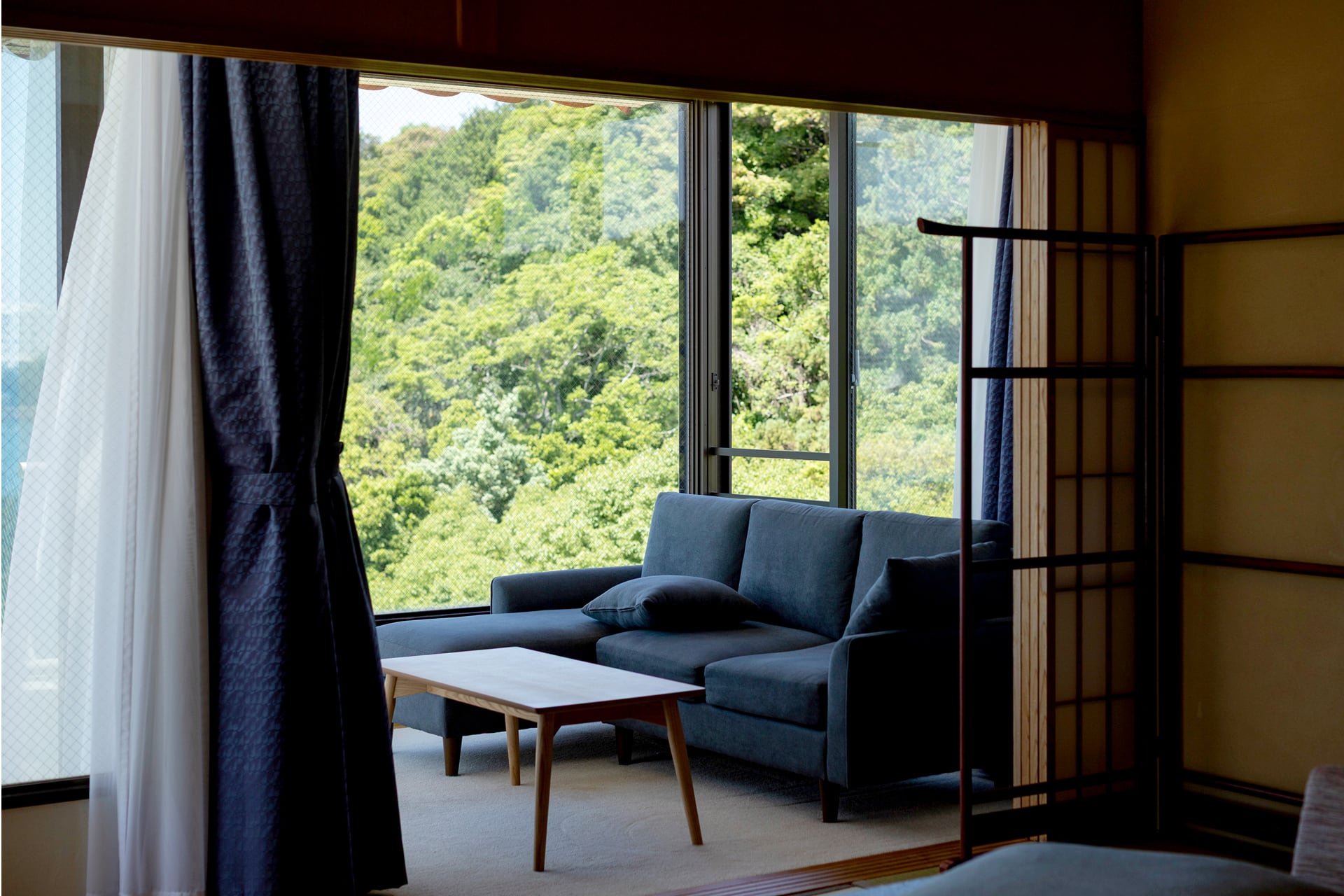 当ホテル唯一の貴賓室です。純和風の15畳間と10畳間、ソファでくつろげる応接間、どのお部屋からも、美しい海のパノラマビューをお愉しみいただけます。化粧台と浴室、お手洗は二箇所兼ね備え、ゆったりと快適にご利用いただけます。ぜひ特別な日に、大切な方と。