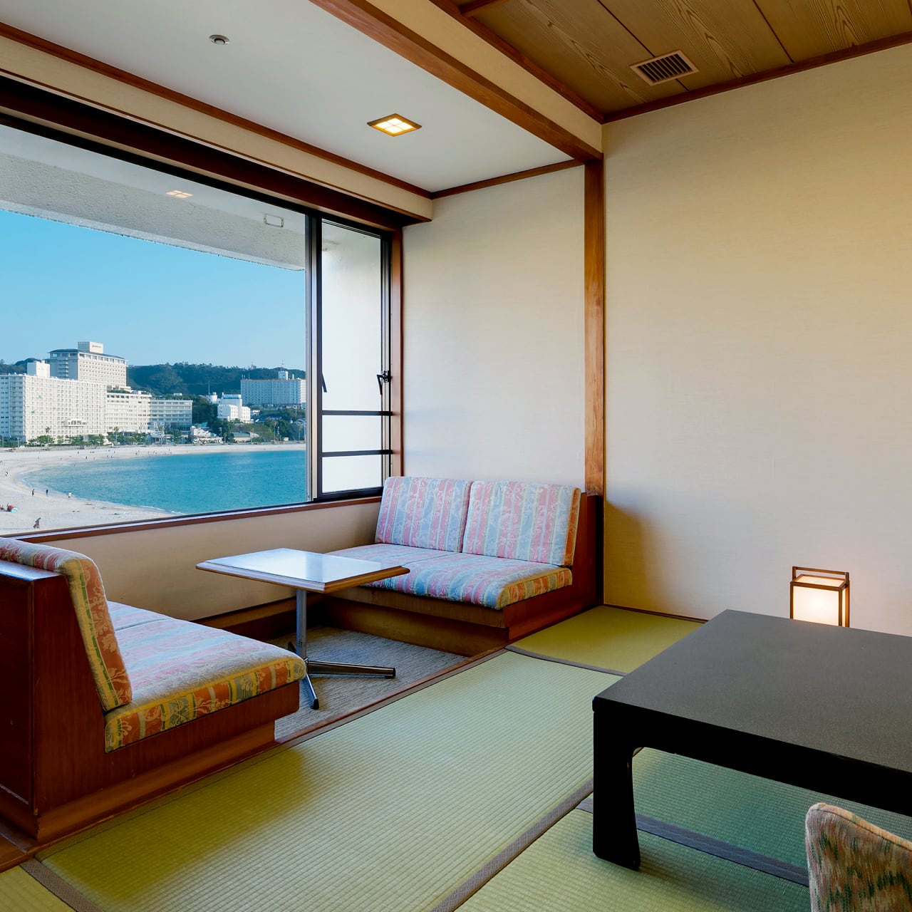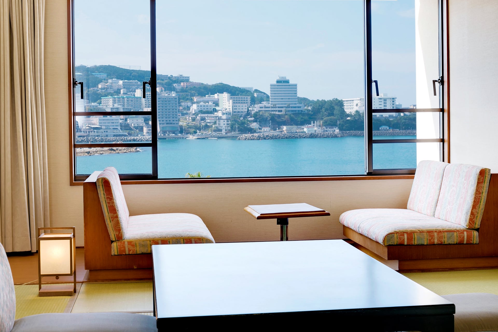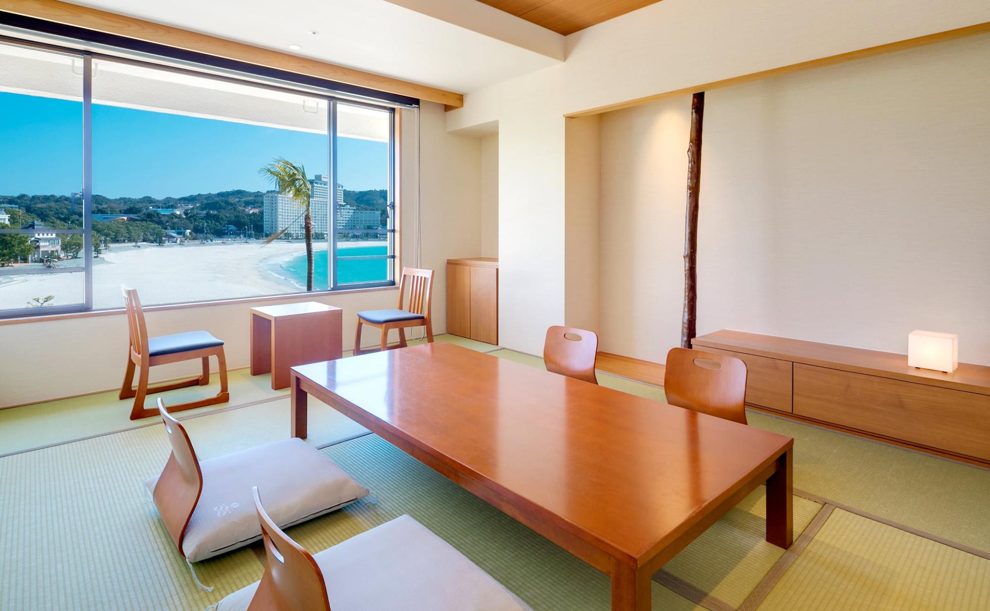 海の景色と畳の居心地を気軽に愉しめる、当ホテルで最も客室数の多い10畳の和室です。窓から聞こえる波の音に包まれ、リラックスしたひとときをお過ごしいただけます。