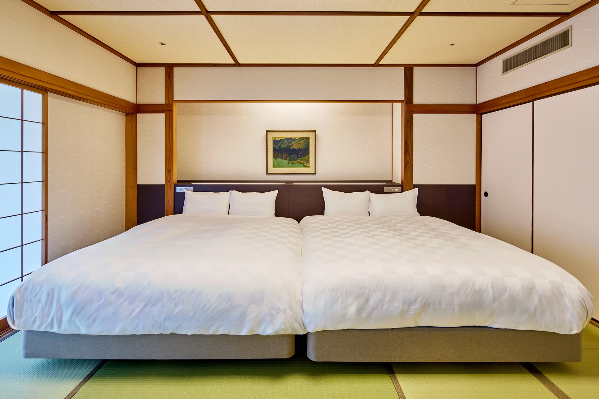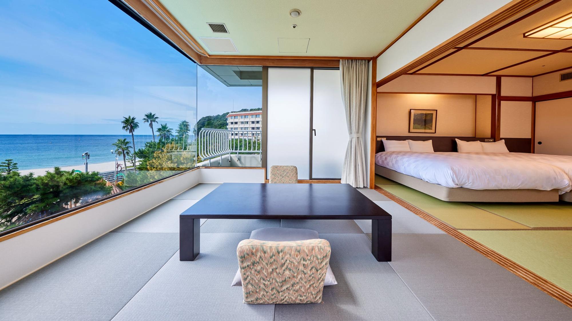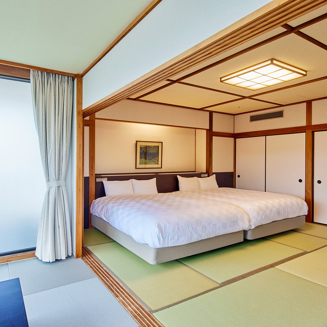 12.5畳の落ち着きのある和室にベッド2台を設置しています。奥行きのある広縁には、ゆったりとくつろげるスペースがあり、心ゆくまで海の景色をお愉しみいただけるお部屋です。