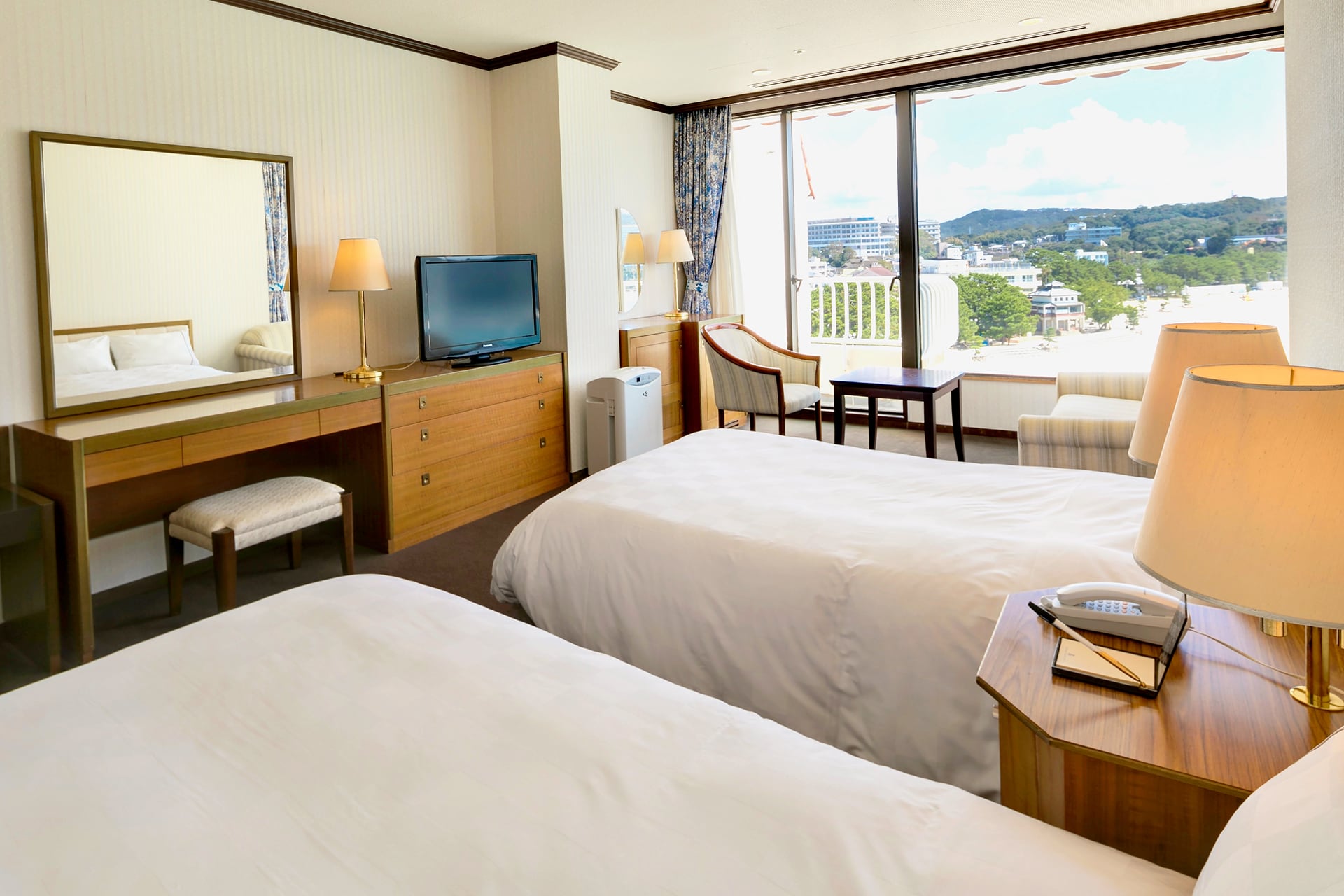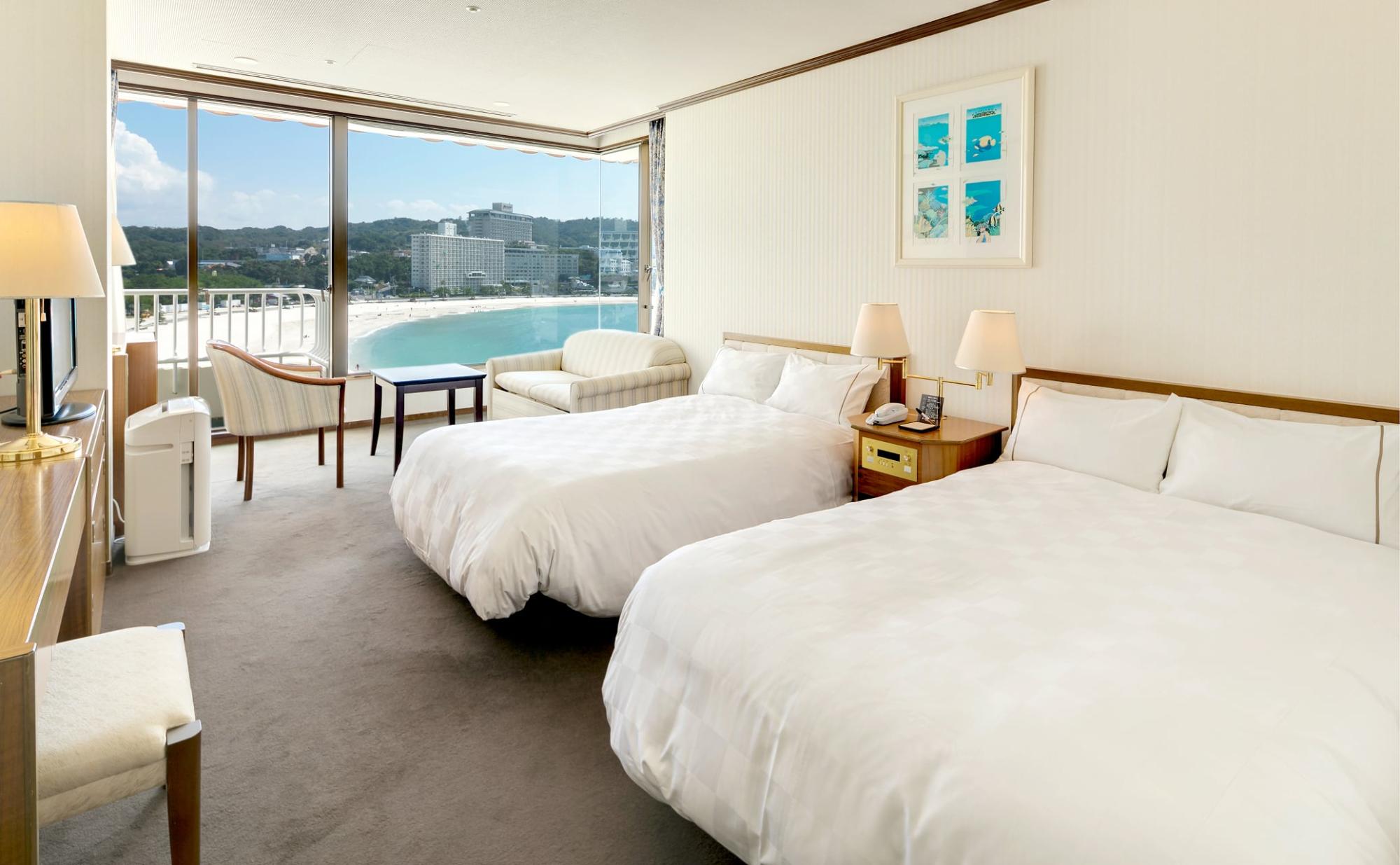 建物の角に位置する1室限定のツインルームでは、大きな窓から海の景色をお愉しみいただけます。ソファベッドを活用することで、最大3名様までご宿泊いただけます。