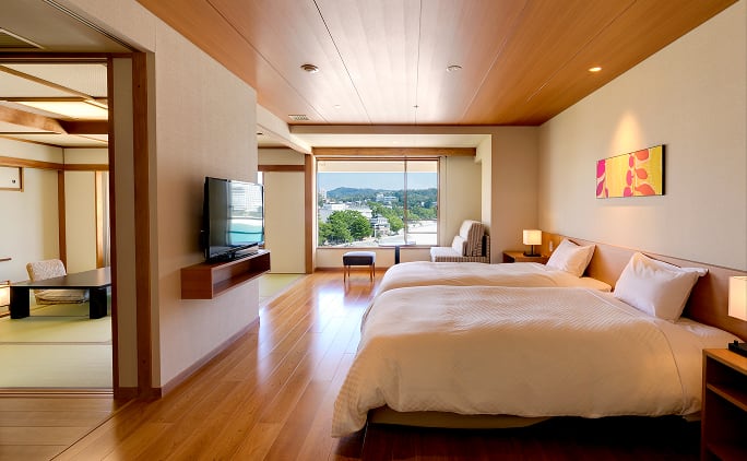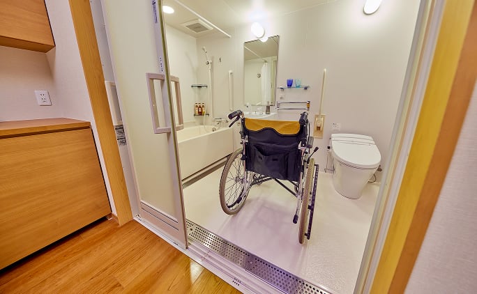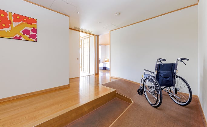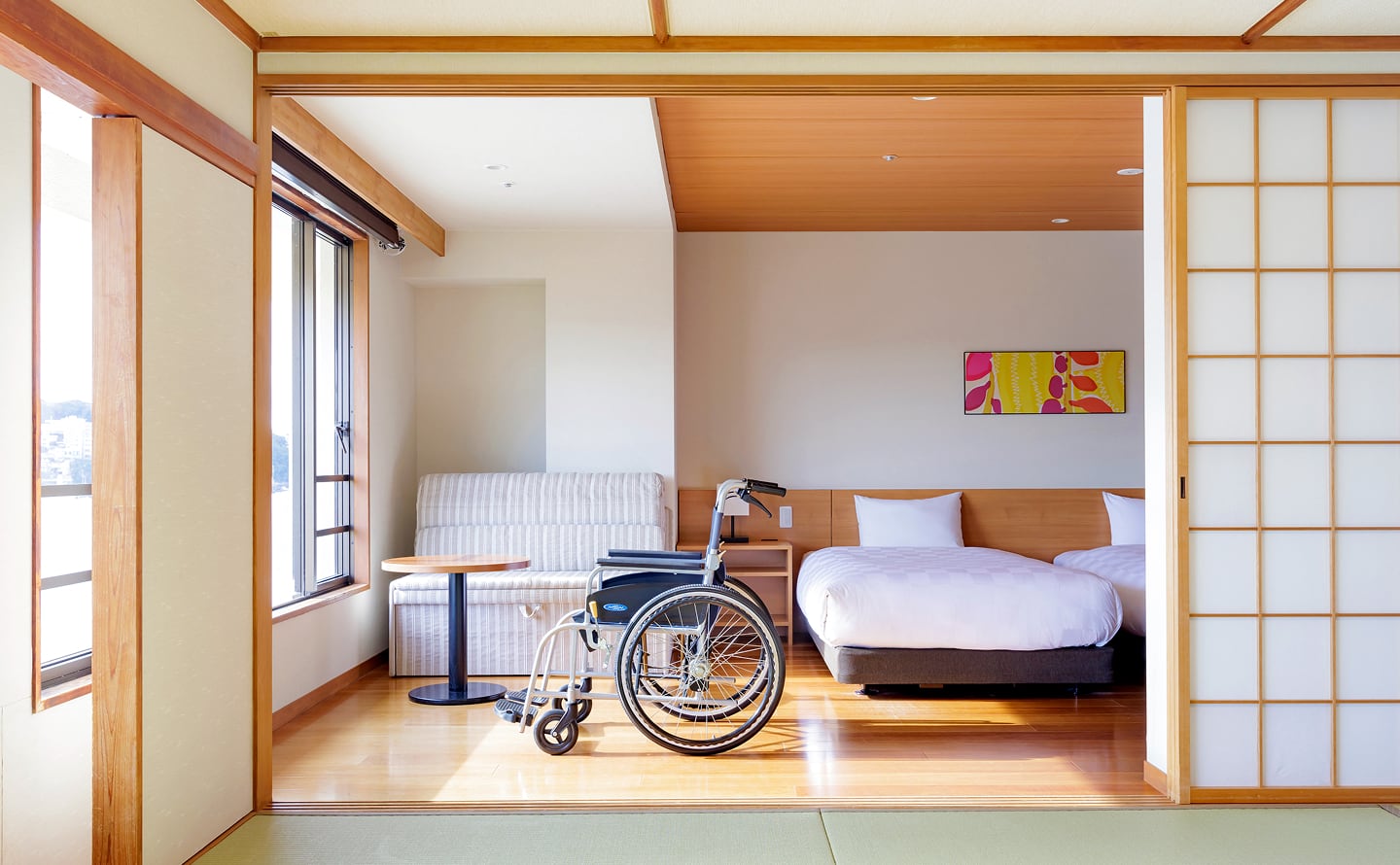 車いすの方にも快適にお過ごしいただけるバリアフリーのお部屋をご用意しております。客室内は段差がなく、スロープや手すりを設置するなど、安全にご利用いただけるよう配慮しています。