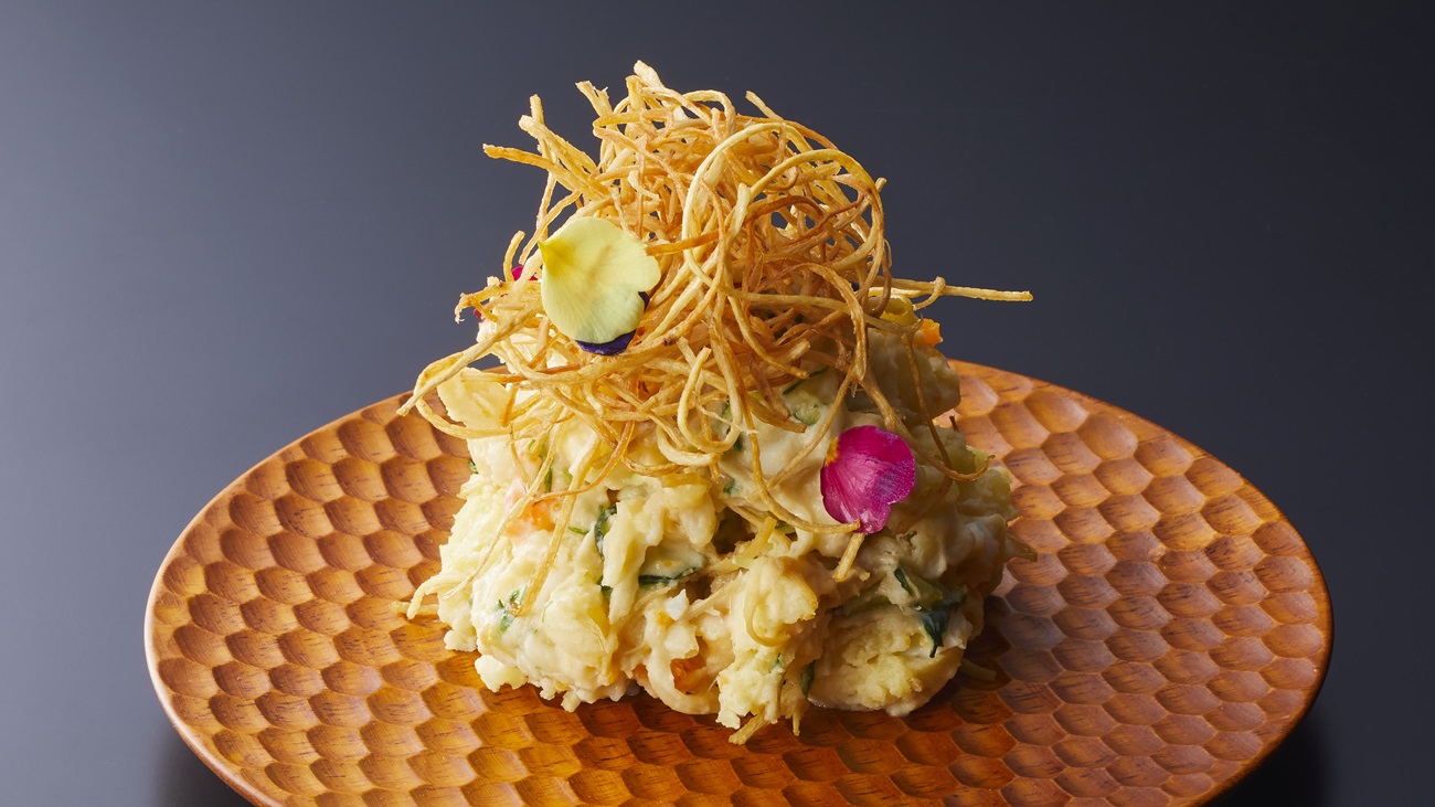 新じゃがいもの瑞々しさと、白味噌のまろやかな甘味とコクを楽しめるポテトサラダです。素揚げのごぼうとお召し上がりになることで、二重の食感を味わえます。