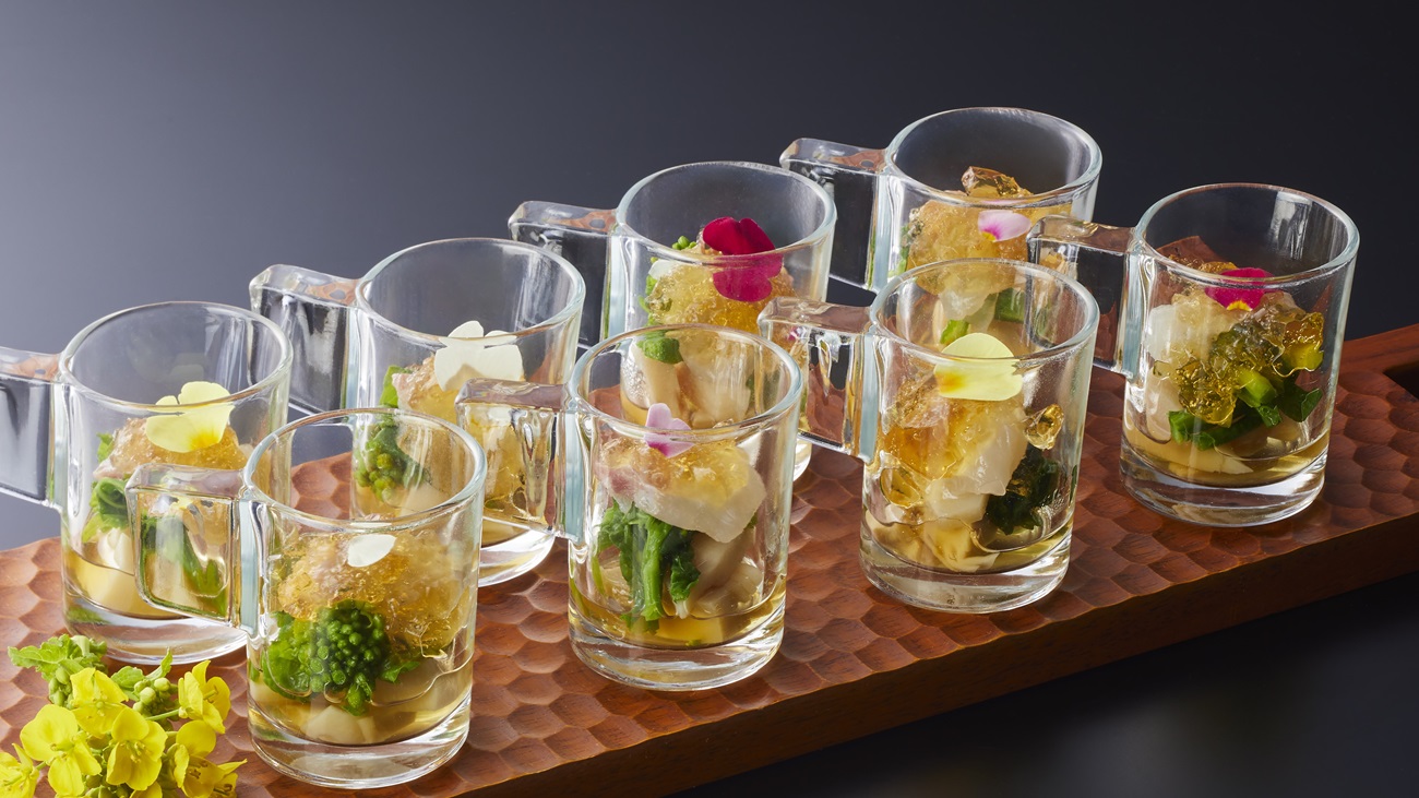 菜の花のほろ苦さと麹が引き出す真鯛の旨味を柚子の酸味と香りが全体をキリっと引き締めた一品です。春の香りをお楽しみください。